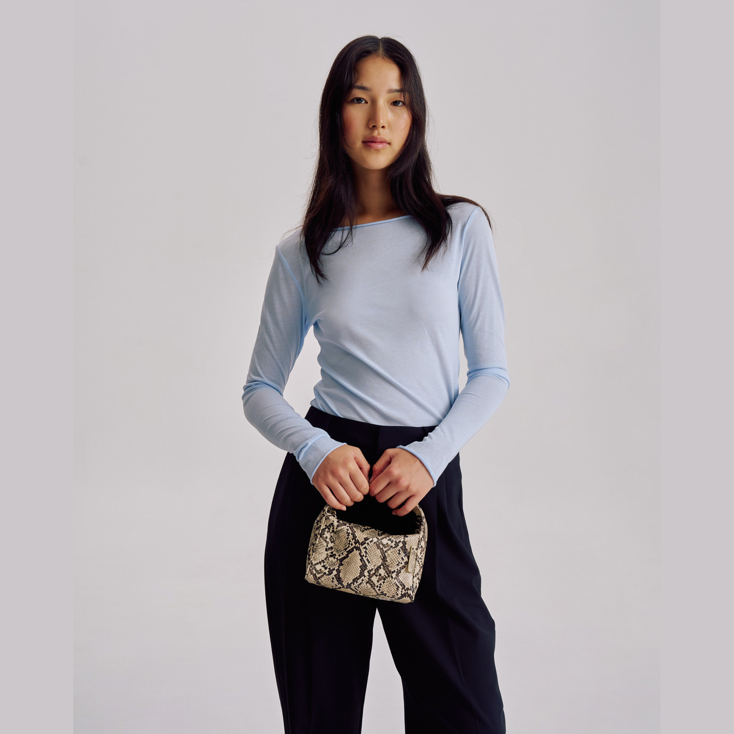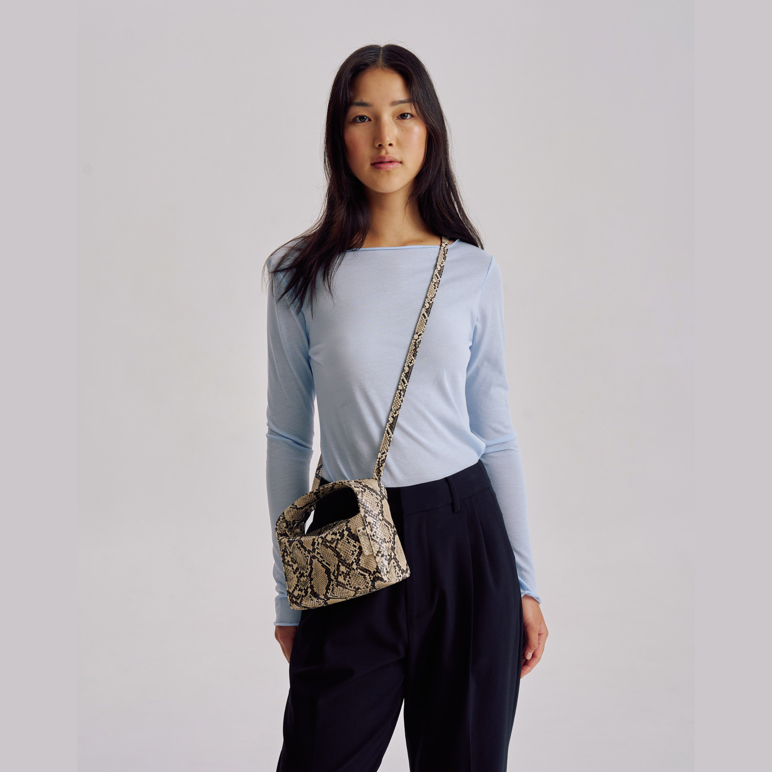 A contemporary essential, the Luca Mini Bag in a beige python print features a sleek yet organic structure.This boxlike look is unassuming in nature yet unforgettable in appearance, making the ideal event bag.
