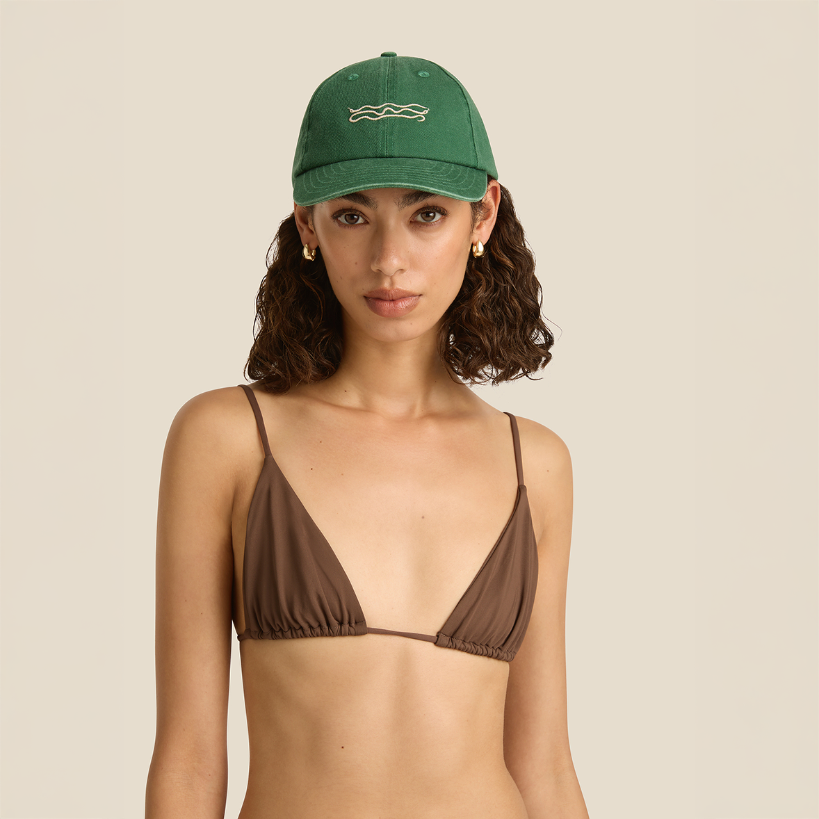 The Ophidian Cap in Forest by Soleil Soleil is a new season take on the classic 'dad cap'. It's unstructured, sits low on the crown and fully adjustable to fit most. Embroidered with the hand‑painted snake motif from the Charm design, with the signature Soleil Soleil logo on the back, this is your new Summer cap.