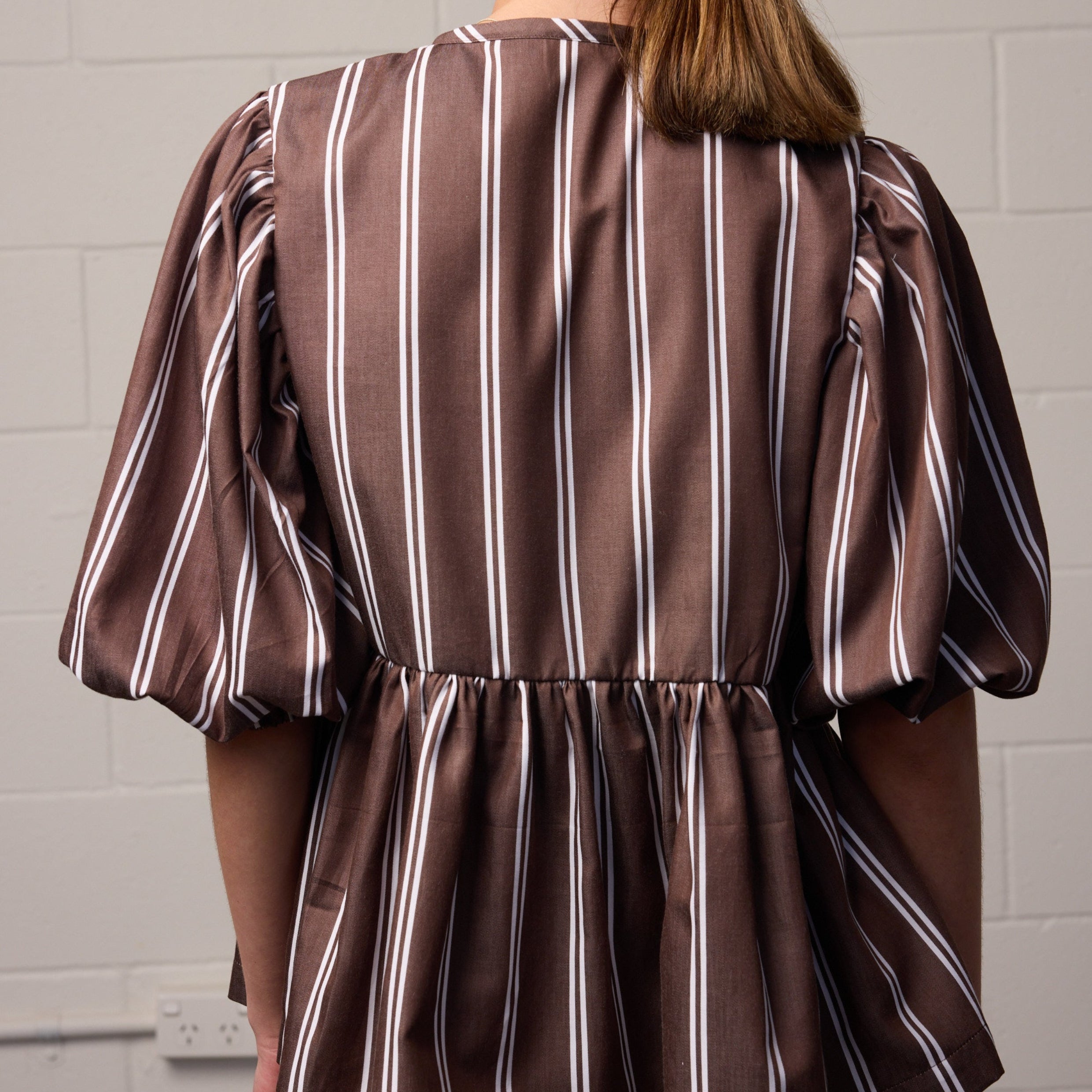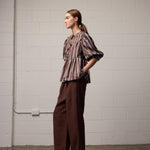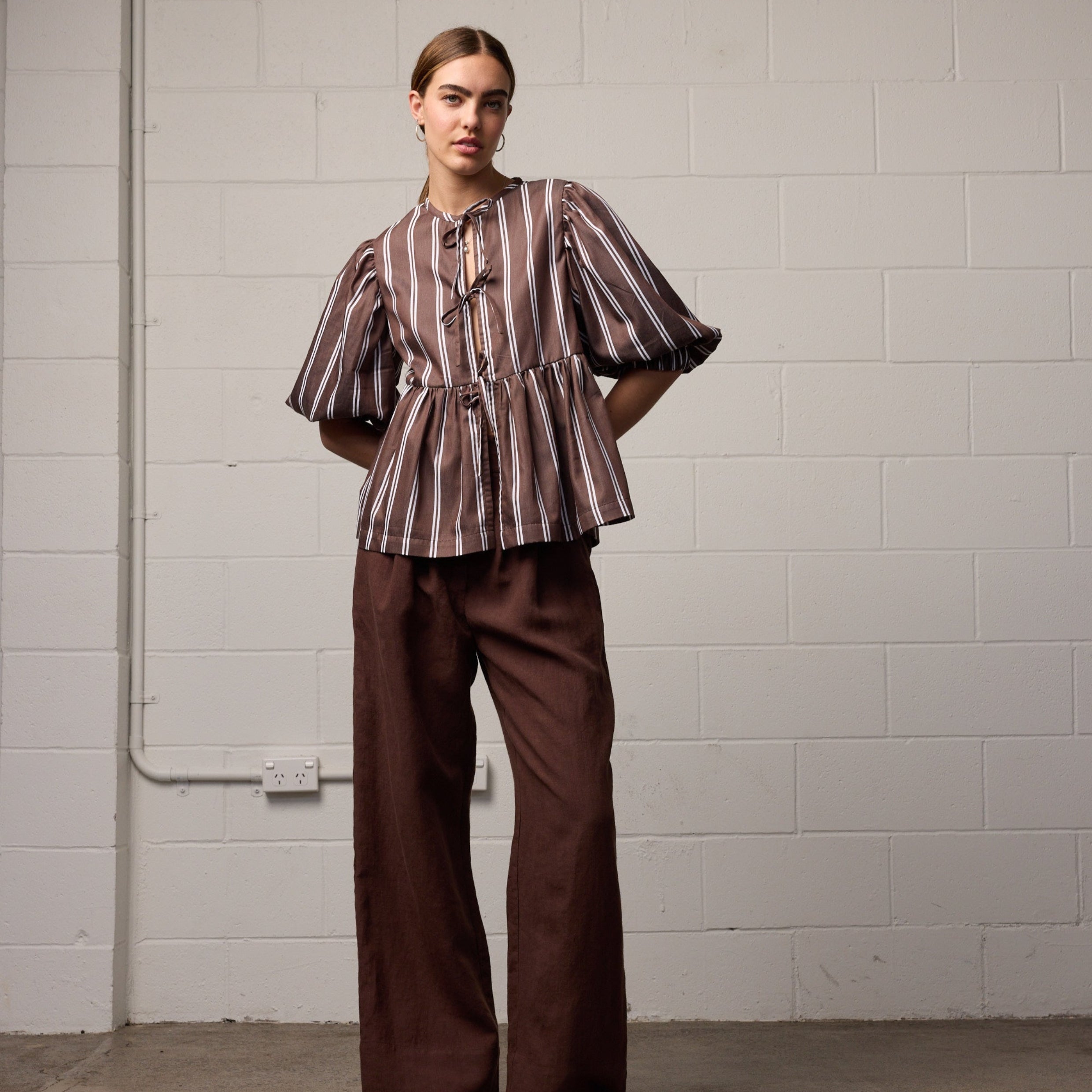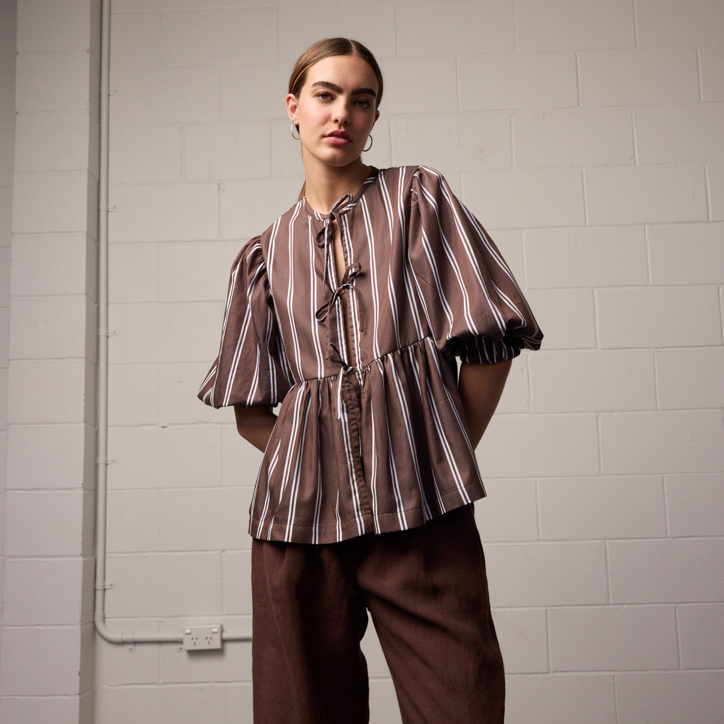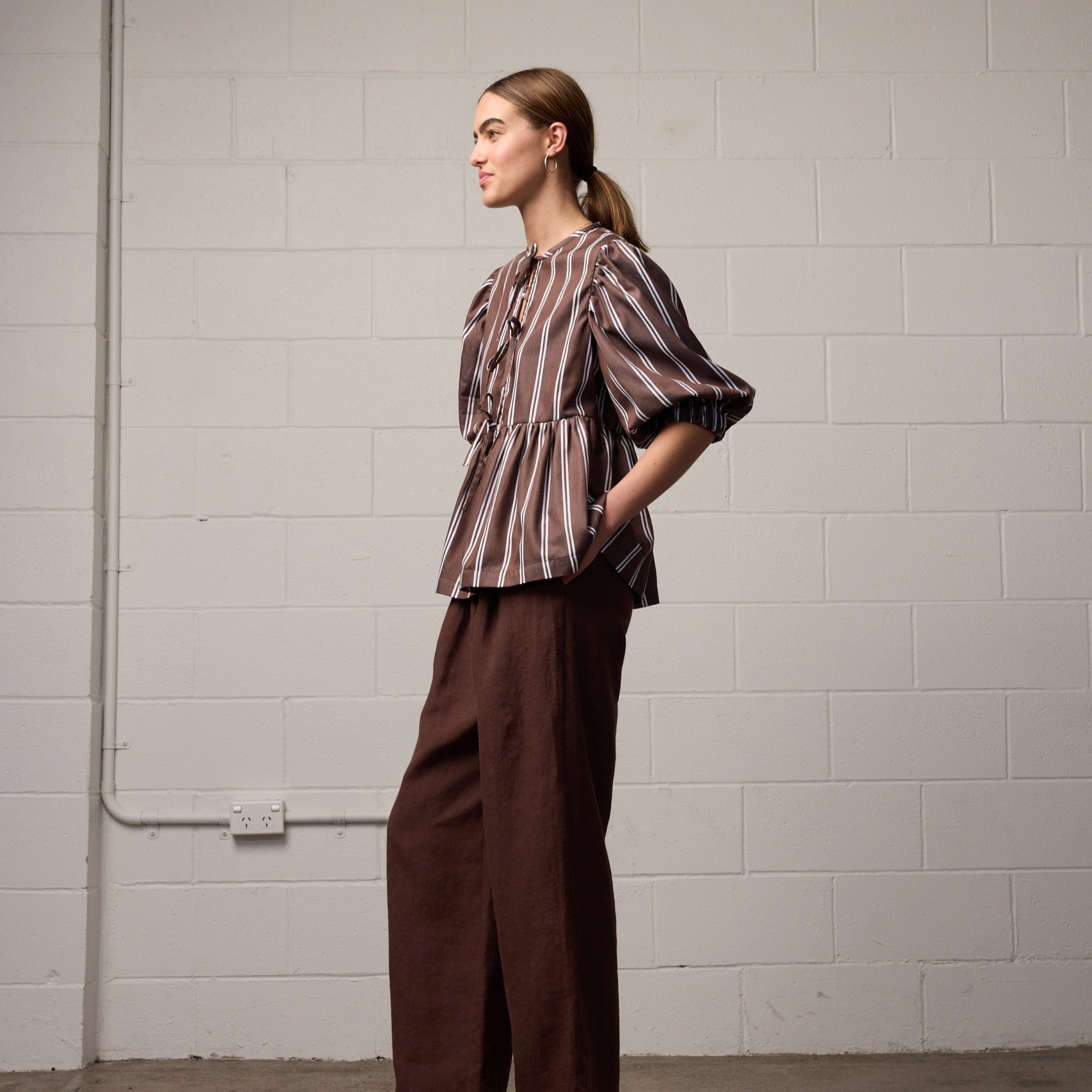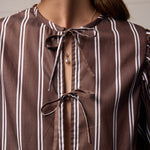 The Coco Top by Towa is a Copenhagen-inspired blouse designed for everyday ease. In a rich chocolate stripe, this piece is perfect for daily coffee catch-ups, styled with classic trousers for work, or layered over a slip dress on warmer days. Finished with self-ties down the front and soft gathers at the sleeve, it brings just the right amount of drama to your look.