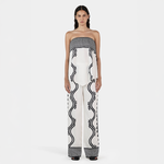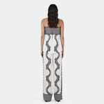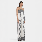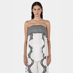 The Franca Bodice by Hansen & Gretel is a strapless bandeau-style top with a structured under-bodice and contrast edging along the top. The hem is angled in front and splits down the centre-back. A hook-and-eye closure at the under-bodice ensures a secure fit.