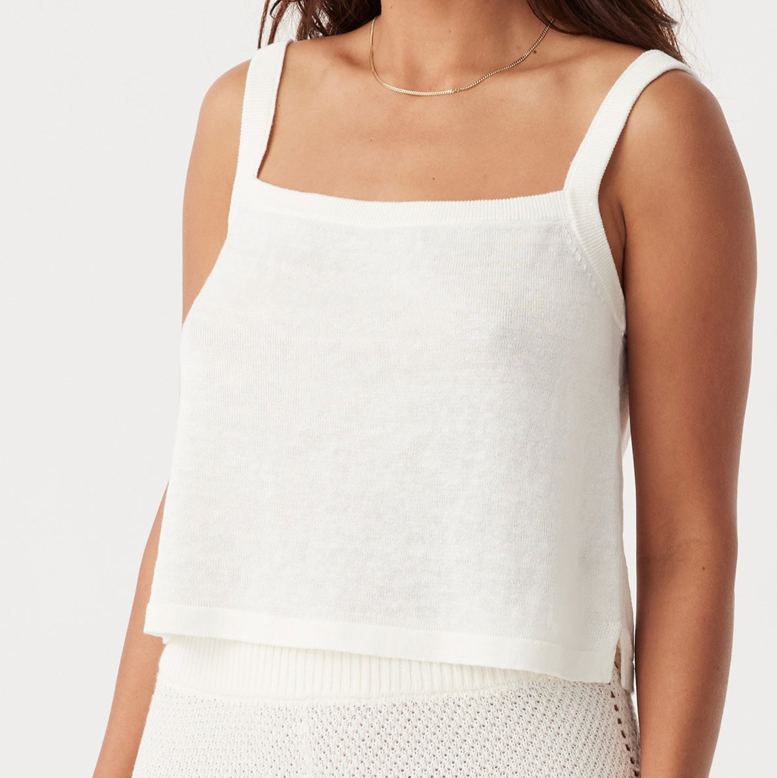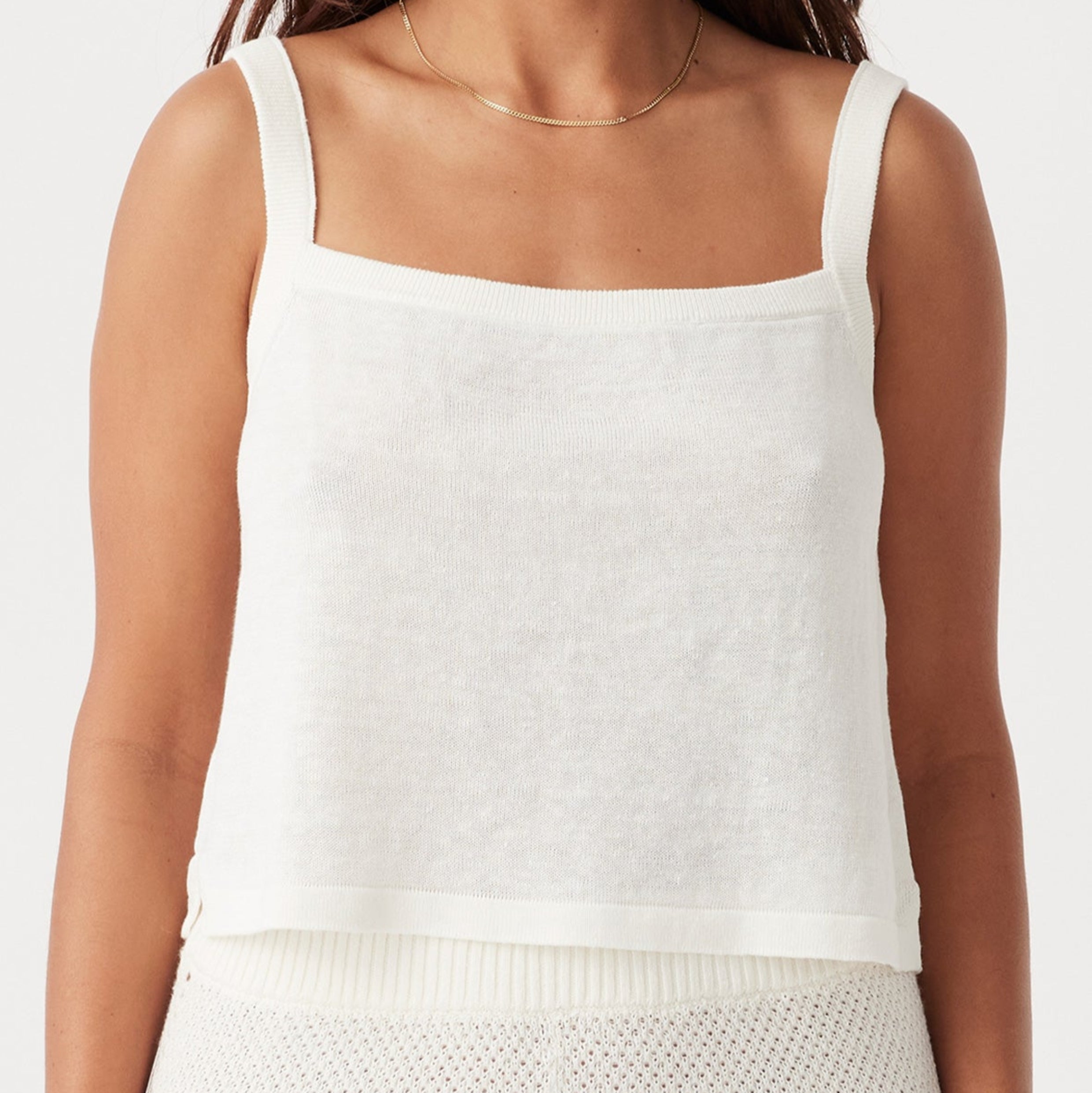 The Brie Tank in Cream features a relaxed, cropped fit that’s perfect for warm-weather days. Crafted from breathable 100% linen knit, this top includes ribbed straps and subtle side splits for a flattering and comfortable silhouette. Whether paired with high-waisted pants or layered for a casual-chic look, the Brie Tank embodies timeless versatility.