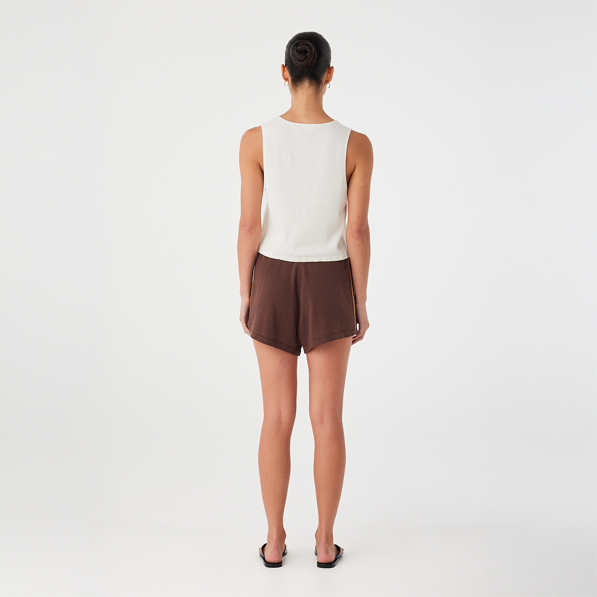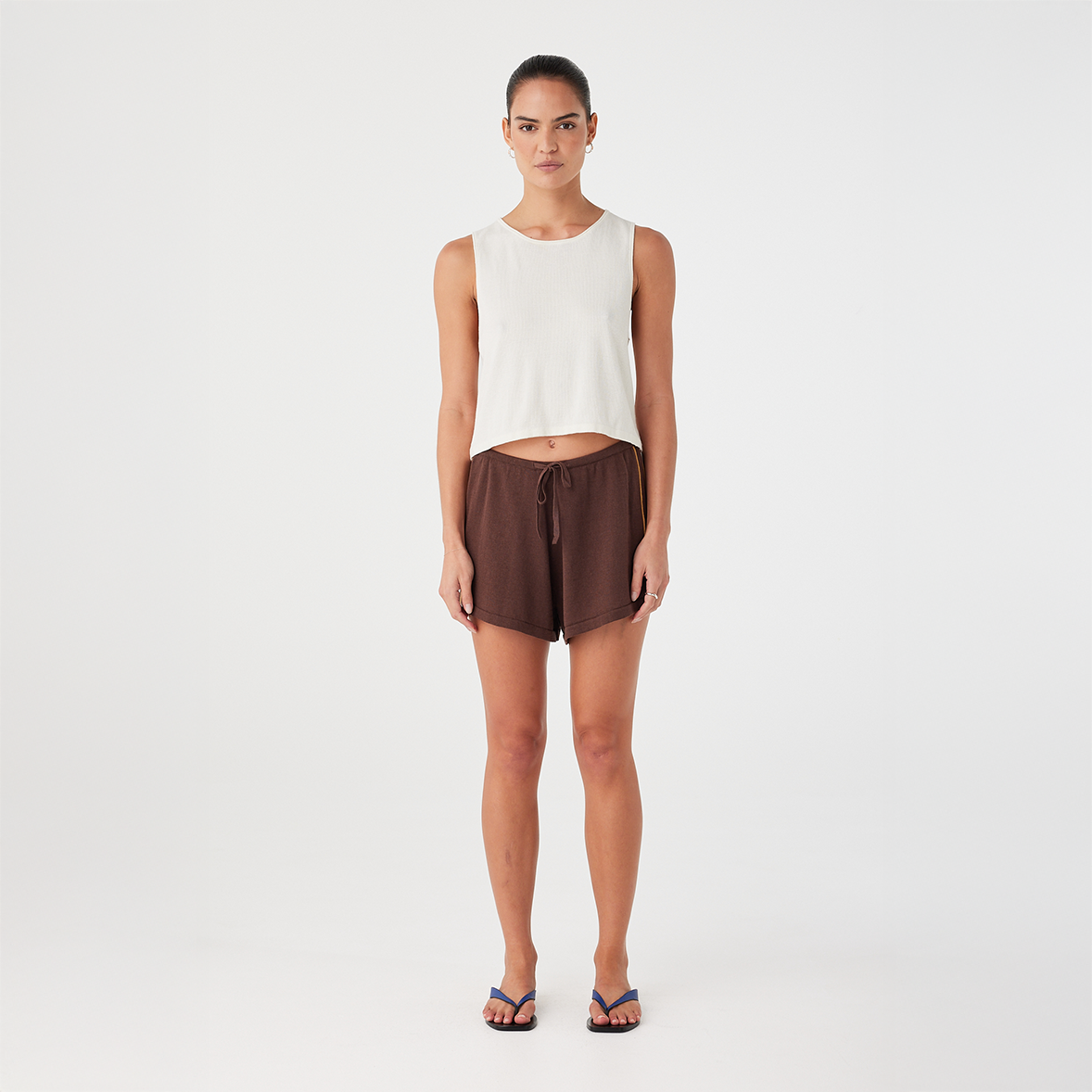 The Pippa Drawstring Short in Espresso by Arcaa is a relaxed fit in a breathable linen and organic cotton knit. Finished with contrast side panel detailing and an adjustable drawcord waist for easy wear.