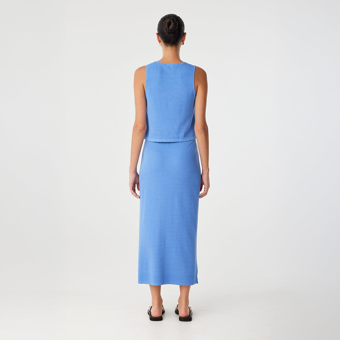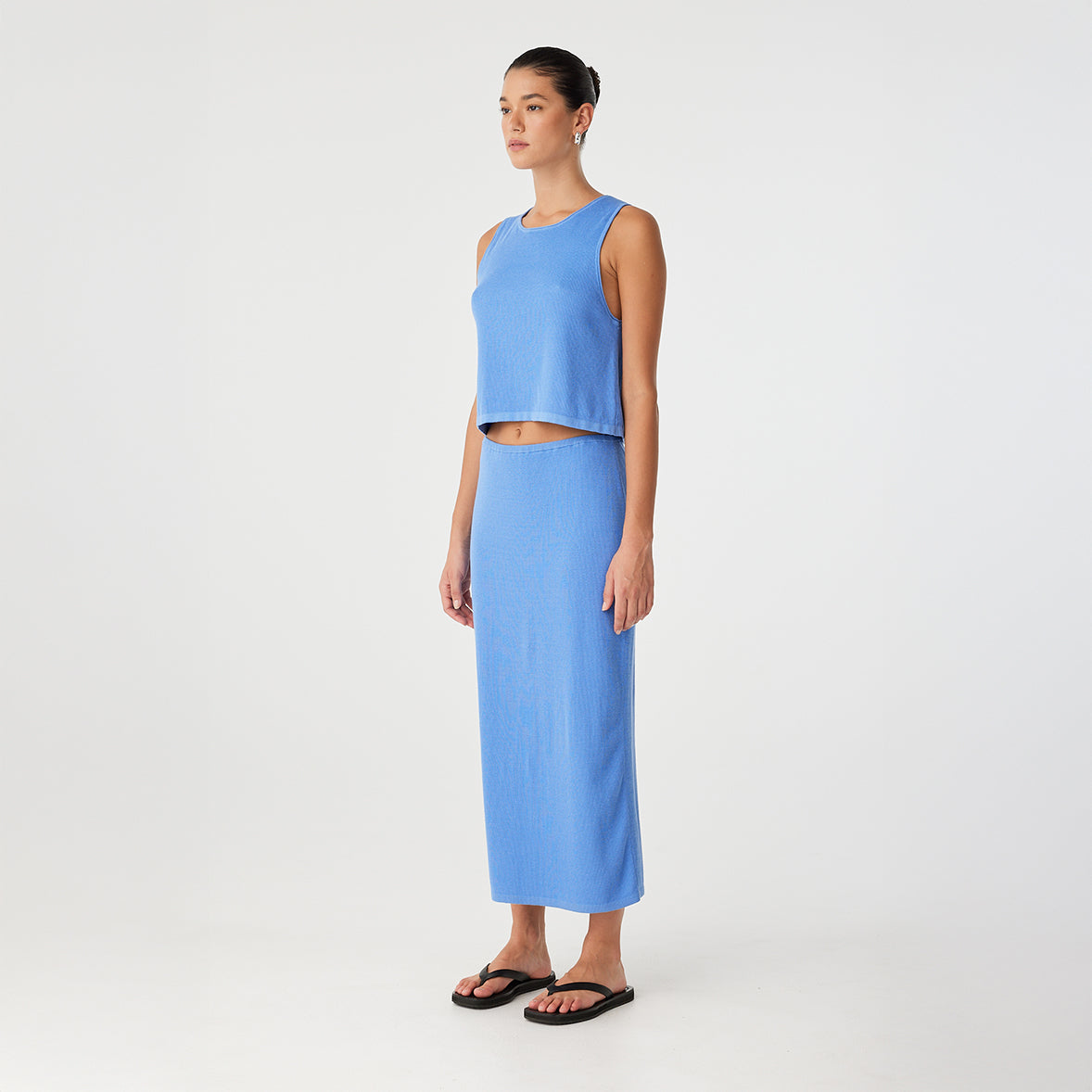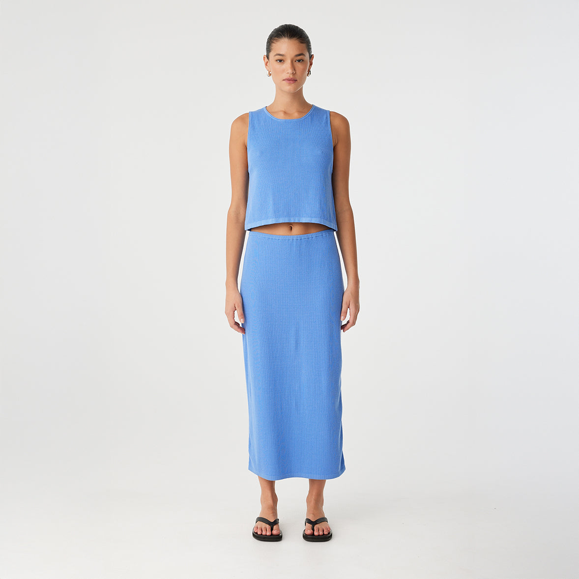 The Theo Tank by Arcaa is a lightweight ribbed knit with a relaxed shape and softly flared hem. Rolled edges at the neck and armholes keep the finish natural and unfussy.