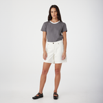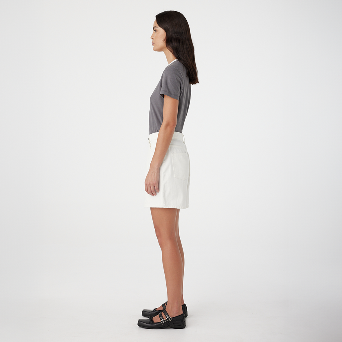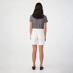 The Martha Short in white by Outland Denim is a modern take on the bermuda. It sits at a mid rise with a relaxed fit through the hip and thigh, finishing just above the knee.