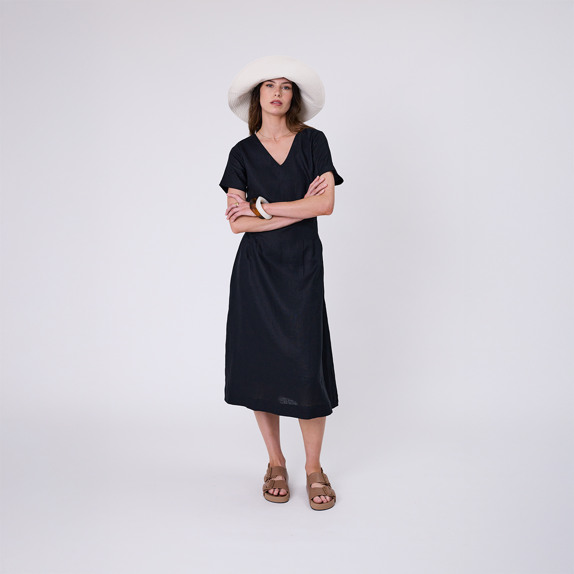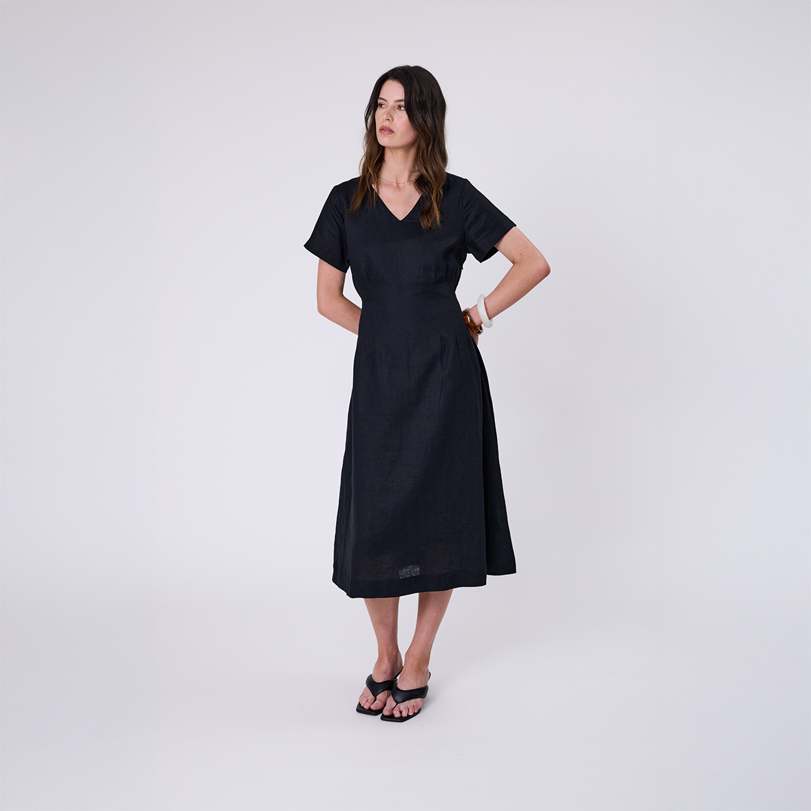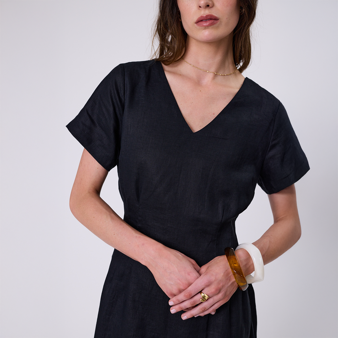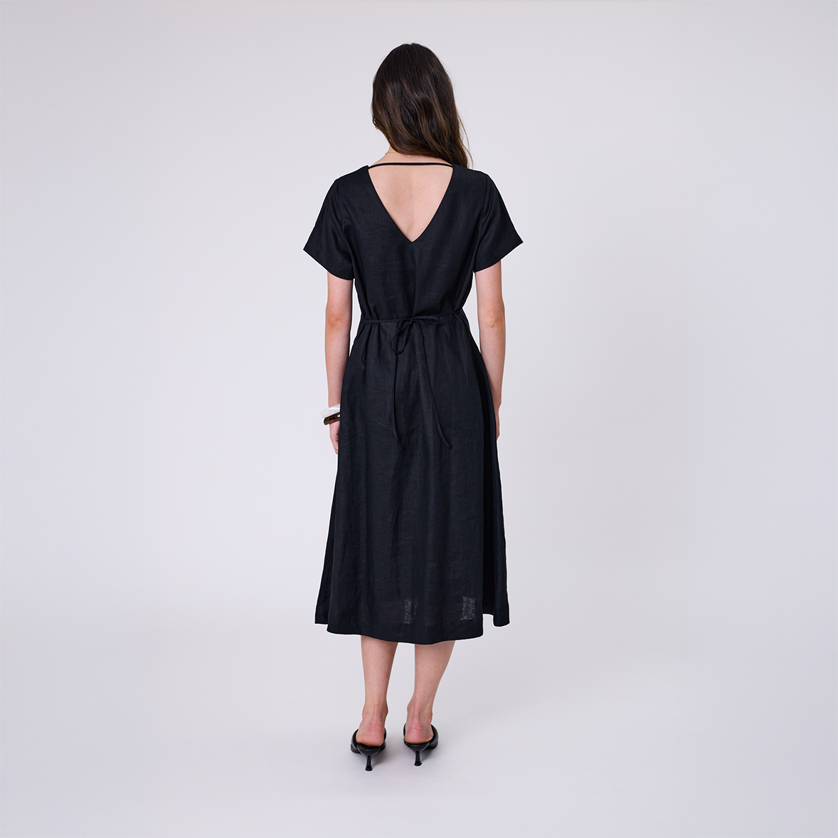 The Seville Linen Dress in black by Marlow brings a sophisticated yet effortless feel to everyday dressing. Crafted from premium European linen with a naturally refined drape, it features a V-neckline and back, short sleeves, and subtle dart detailing through the waist for soft structure. Adjustable self-ties can be fastened at the front or back to create a personalised fit for any occasion.