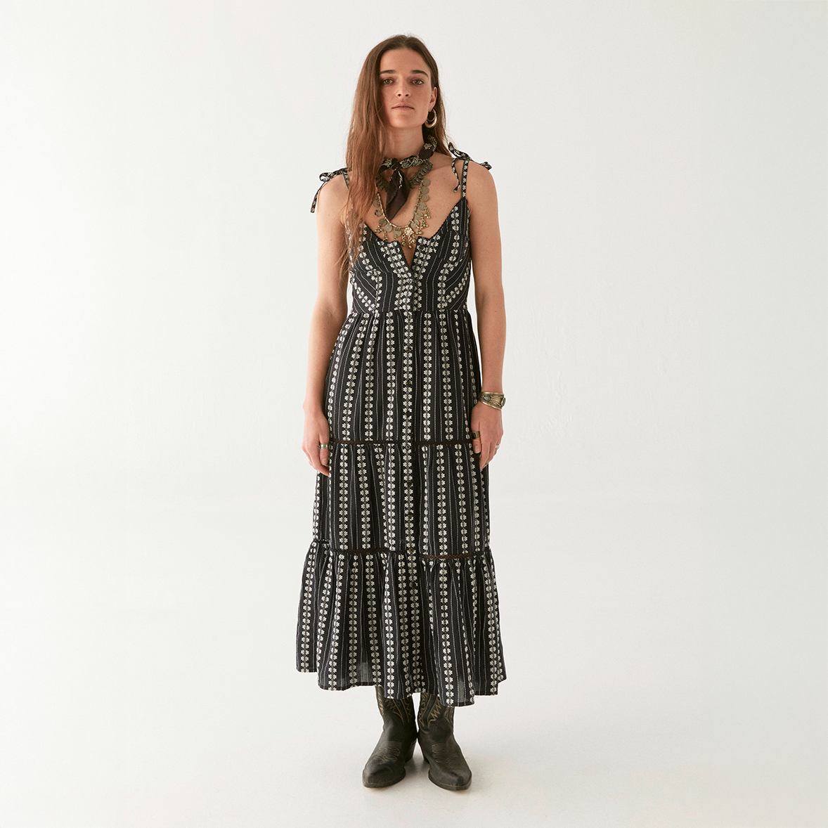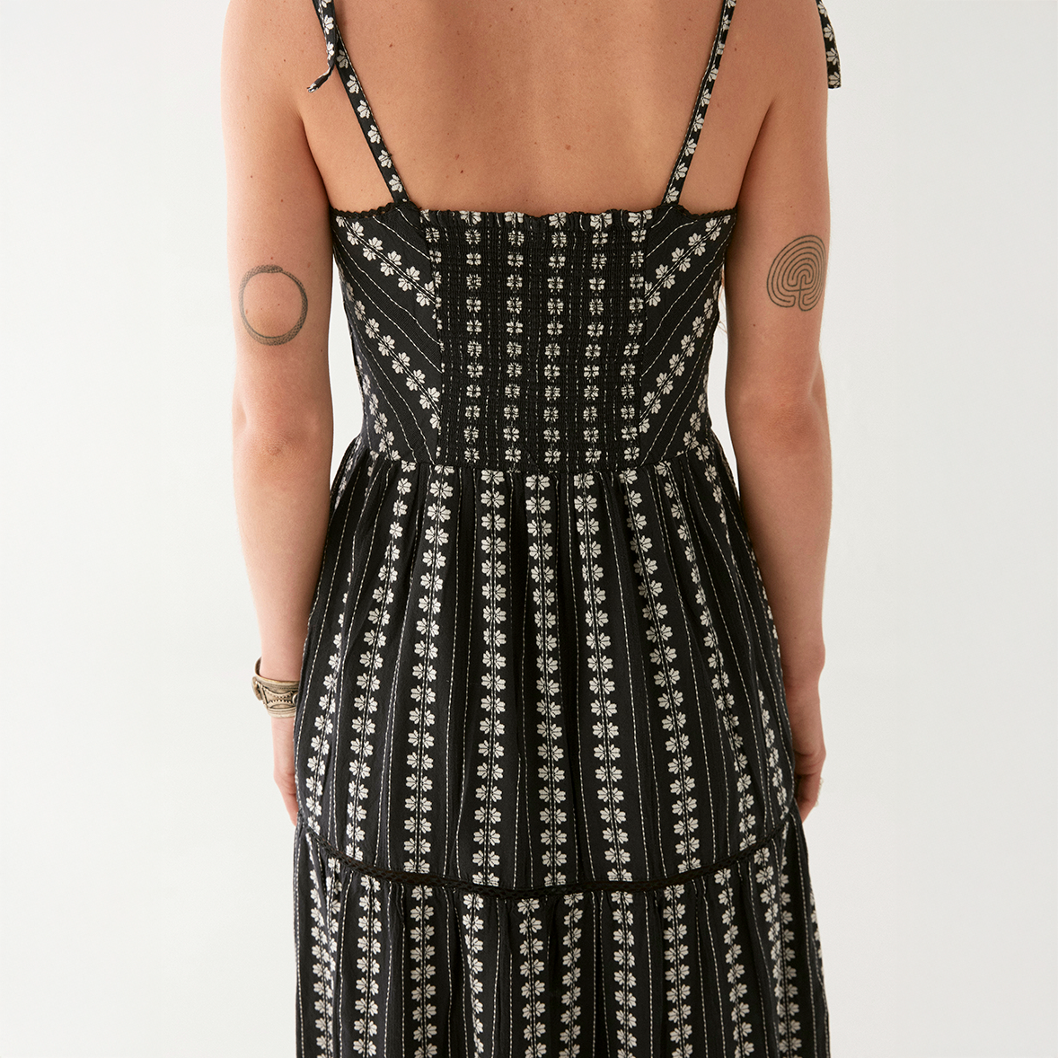 A smocked bodice sculpts fluid movement across a tiered skirt, while adjustable tie‑straps add romantic ease. Style it with boots for nights out or sandals for sunlit wandering.