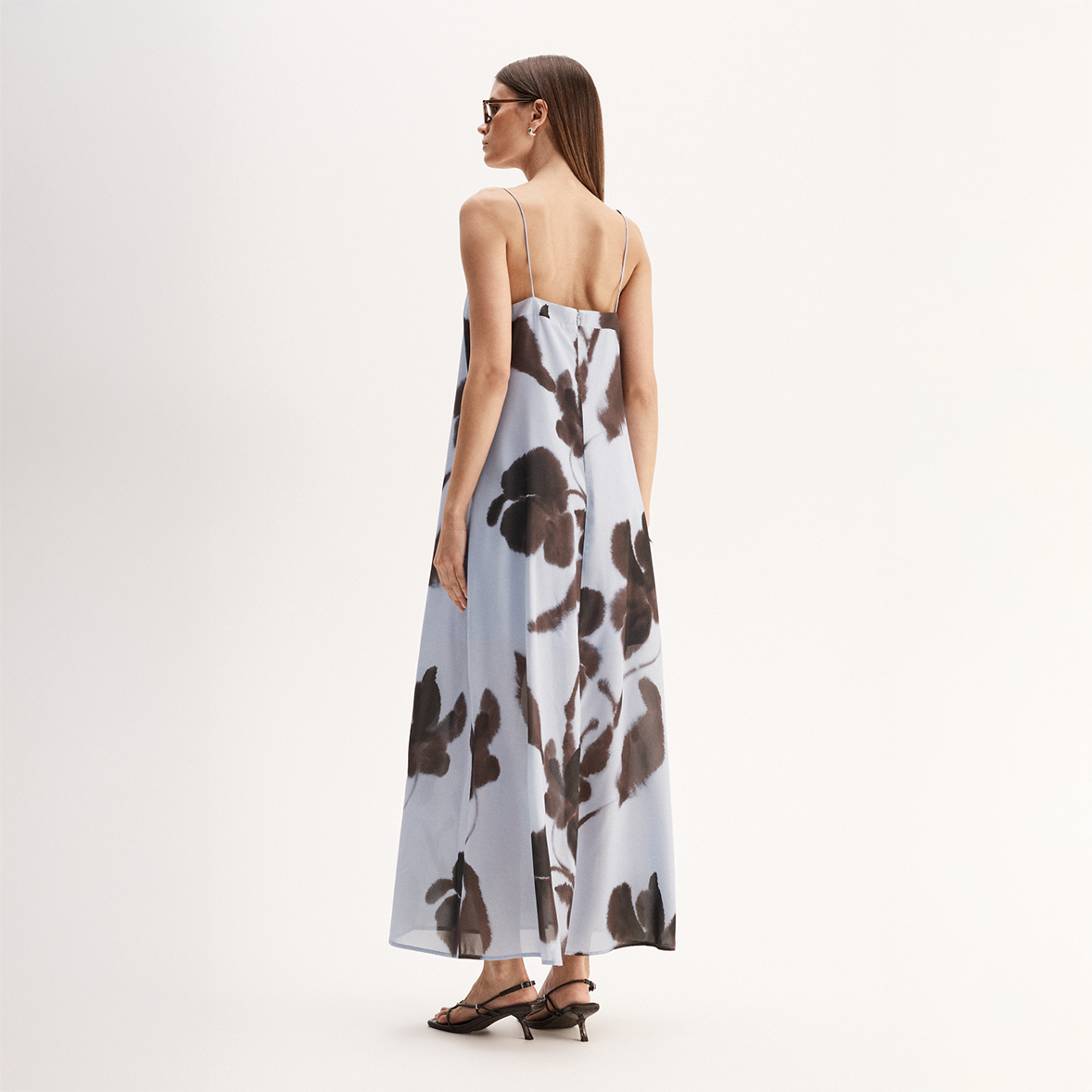 The Monet Maxi Dress by Elka Collective is fashioned in a soft, satin-like fabric featuring an exclusive chocolate floral print and contrasting chrome hardware at the neckline. The designed oversized silhouette gives effortless drape for day or night.
