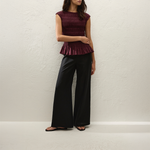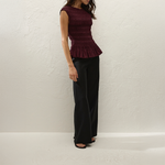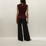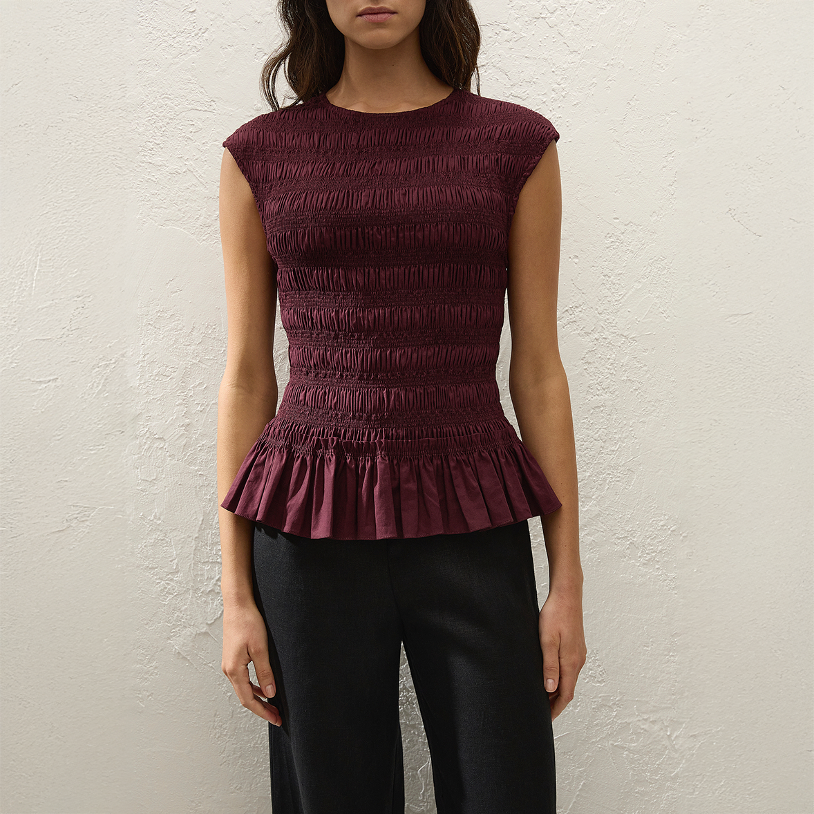 The Ale Top in Mulberry from Faithfull the Brand is an everyday top crafted from 100% BCI certified organic cotton, yarn-dyed in a deep mulberry hue. Fitted through the bodice with a shirred effect, it features a high rounded neckline and short cap sleeves, finishing with a softly gathered peplum hem.