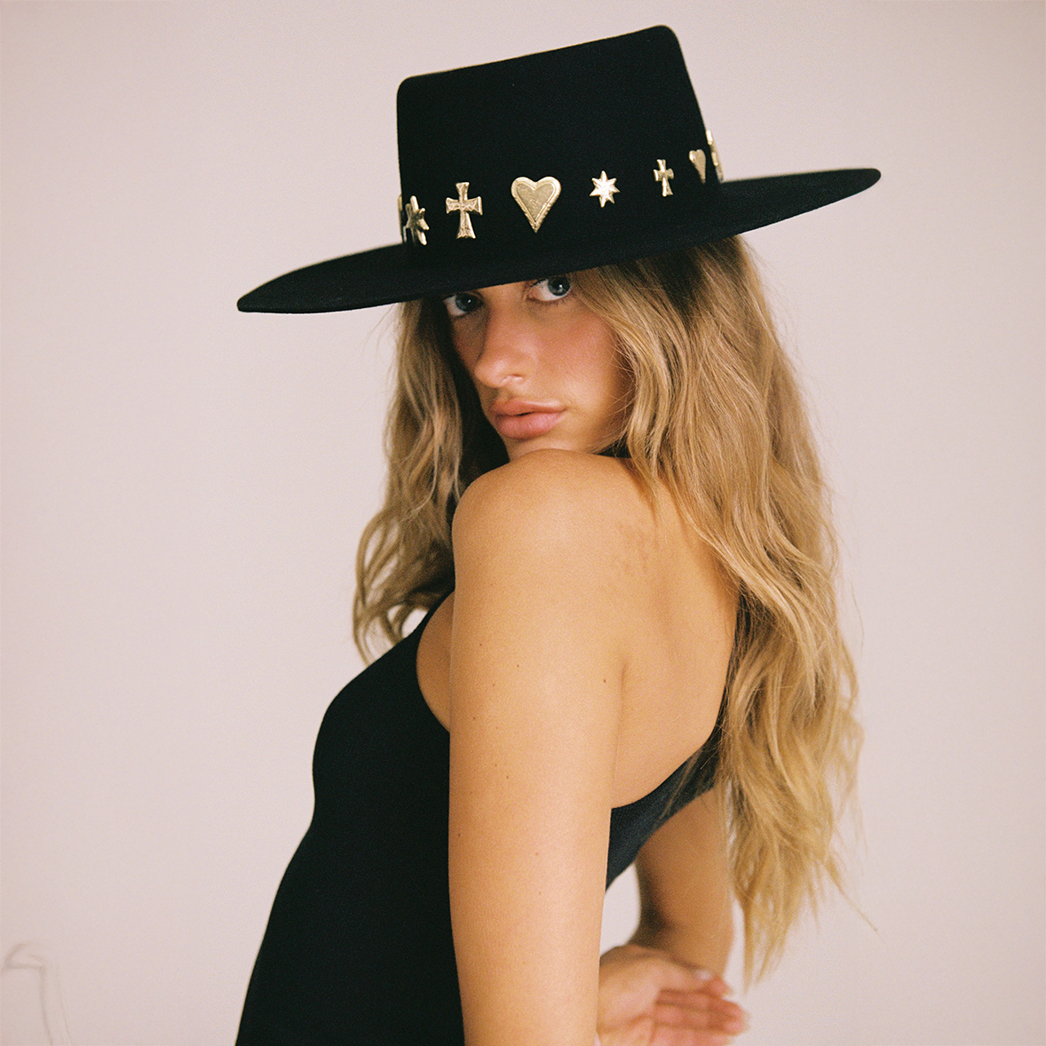 - Black boater with dipped crown and custom brushed gold finish star cross and heart conchos