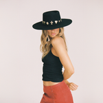 The Celestial Boater by Lack of Color is a black dipped crown boater detailed with brushed gold effect conchos for a refined finish. A classic flat brim balances clean lines with statement hardware for day to night wear.