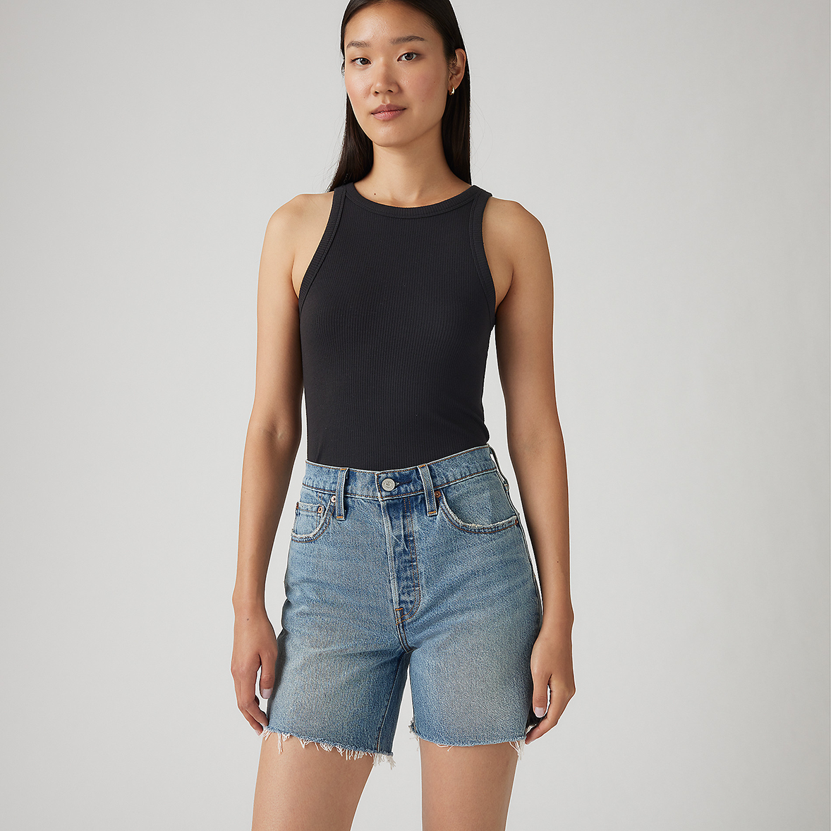 The High-Rise Mid-Thigh Jean Shorts by Levi’s offer vintage blue with modern structure. Cut to sit high on the waist and fall mid-thigh, they strike the perfect balance between retro and current.
