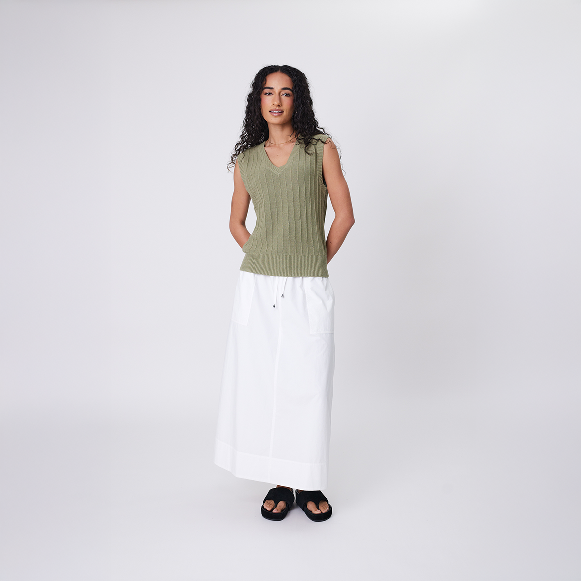 The Evergreen Knit Vest by Marlow is designed to transition your wardrobe into the warmer months. The premium cotton and linen yarn offers breathability and structure, knitted in a unique reversed rib design for added texture. This vest features a relaxed fit and is finished with a crossover v-neckline and ribbed trims.