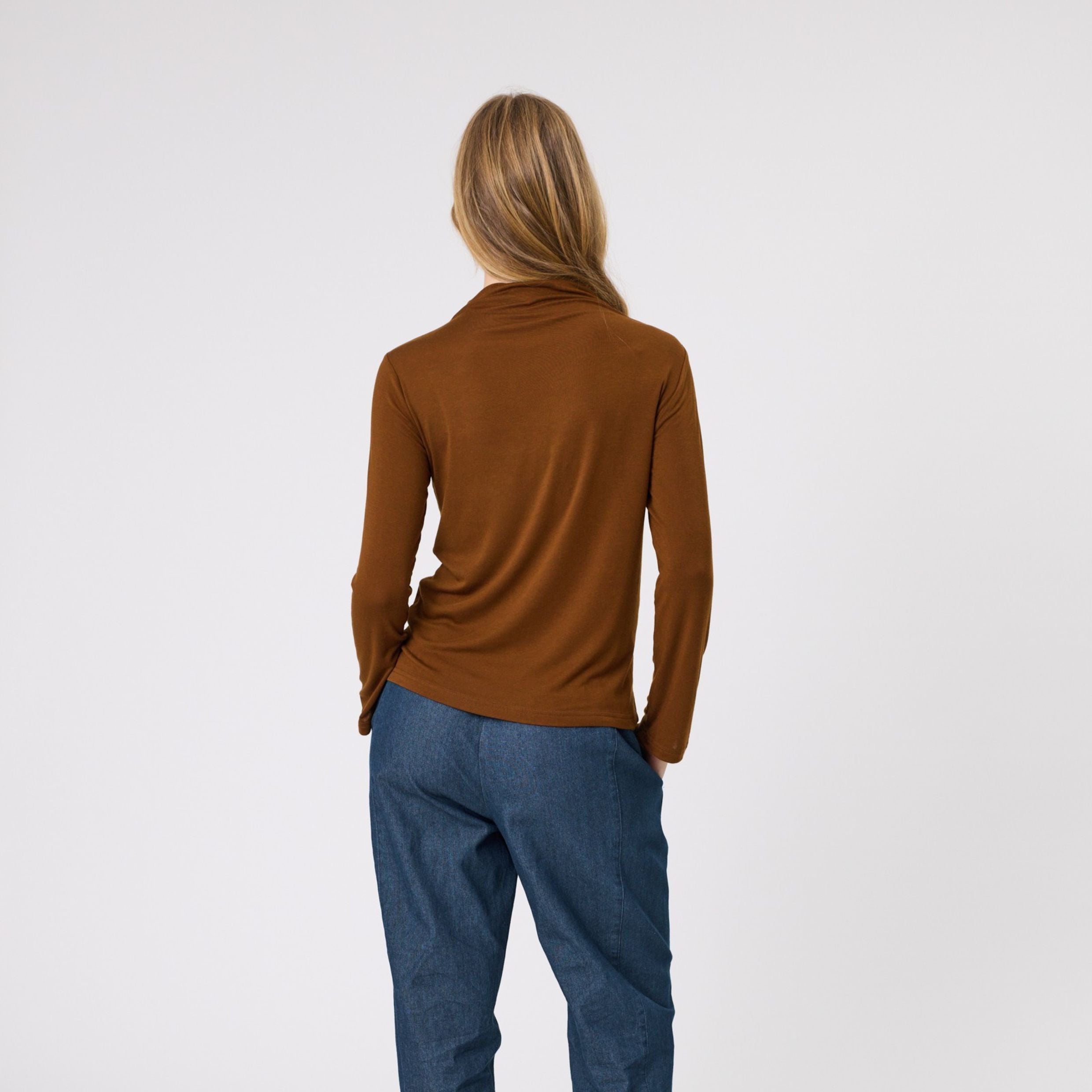 An easy-wearing lightweight jersey, the Weekender Long Sleeve is a bulk-free layering essential. This relaxed fit is crafted in a refined tencel-wool stretch blend with a chic mock neck and slightly flared sleeves. The perfect layering piece for the trans-seasonal wardrobe, wear with denim and layered under a jacket for those off-duty errands.
