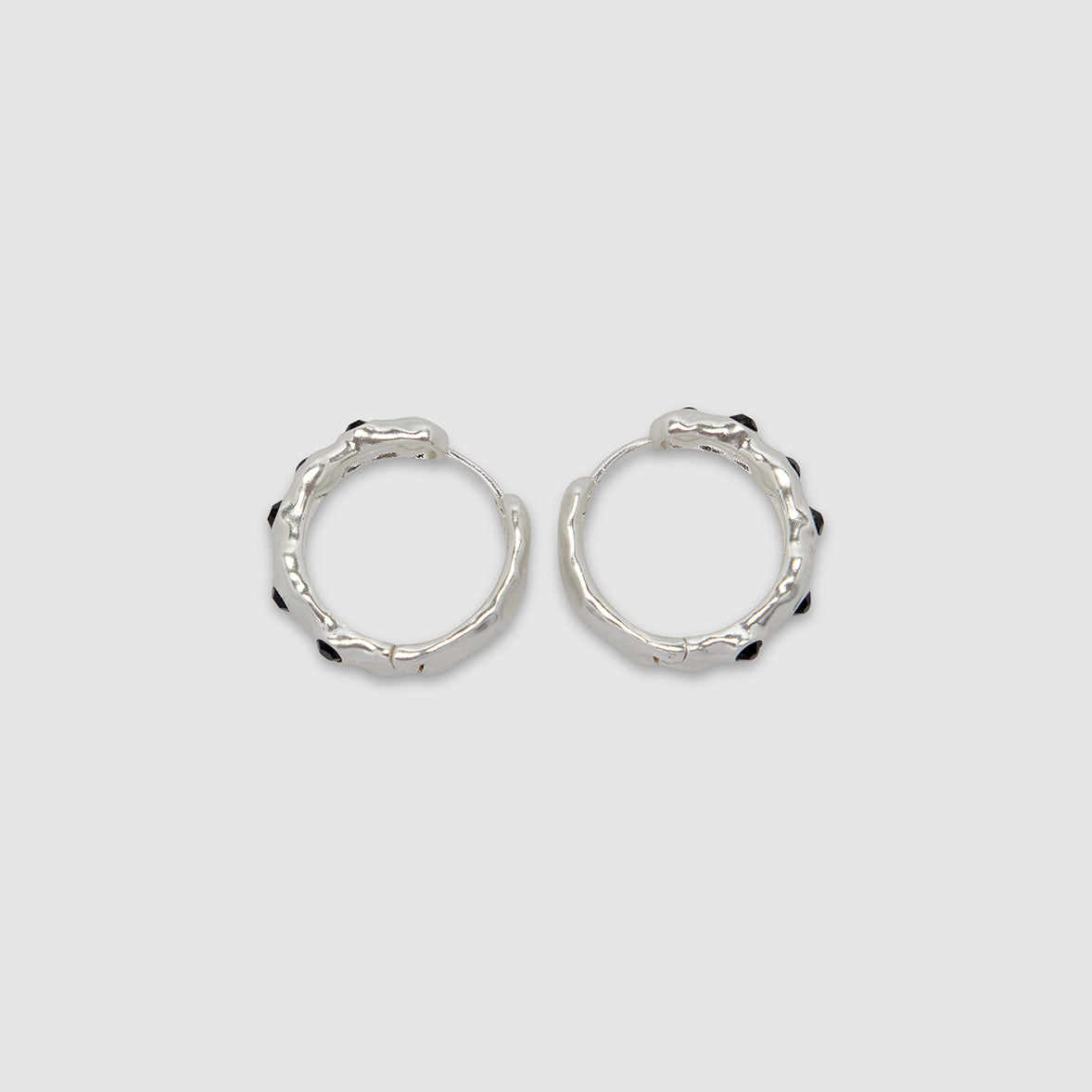 The Asta Hoops in Silver & Black from Brie Leon are a sculptural hoop earring designed with a subtle nod to the polka dot. Crafted in a silver-plated finish, each organic hoop is adorned with intentionally placed black cubic zirconia stones—small inky accents that catch the light with gentle movement.