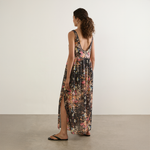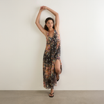 The Beachside Maxi Dress in Camelia Print from Auguste the Label is a best-selling maxi designed with a black-based print and striking border detailing. Featuring a round neckline with a specialty gold button-front closure and a beaded neck tie, it falls into a relaxed, floaty silhouette with side splits for easy movement. Crafted from cotton with metallic thread woven throughout, it is finished with a separate slip.