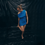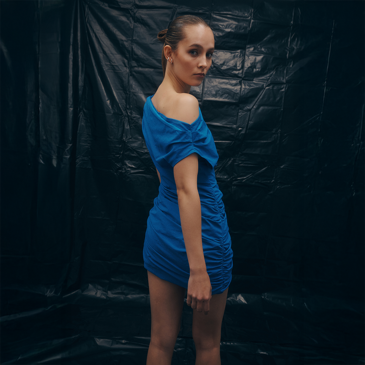 The Nell Mini Dress in Sonic Blue from One of Others is a sculptural mini dress designed with a wide cowl neckline and an asymmetric hemline. Gathered and draped through the waist and skirt, it can be worn on or off the shoulder, offering versatility in styling while maintaining a considered, modern shape.