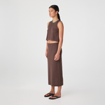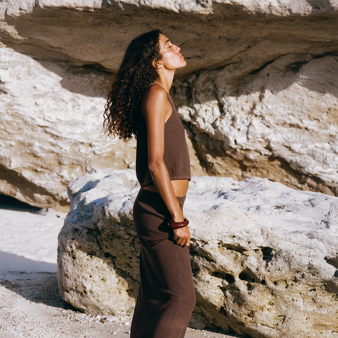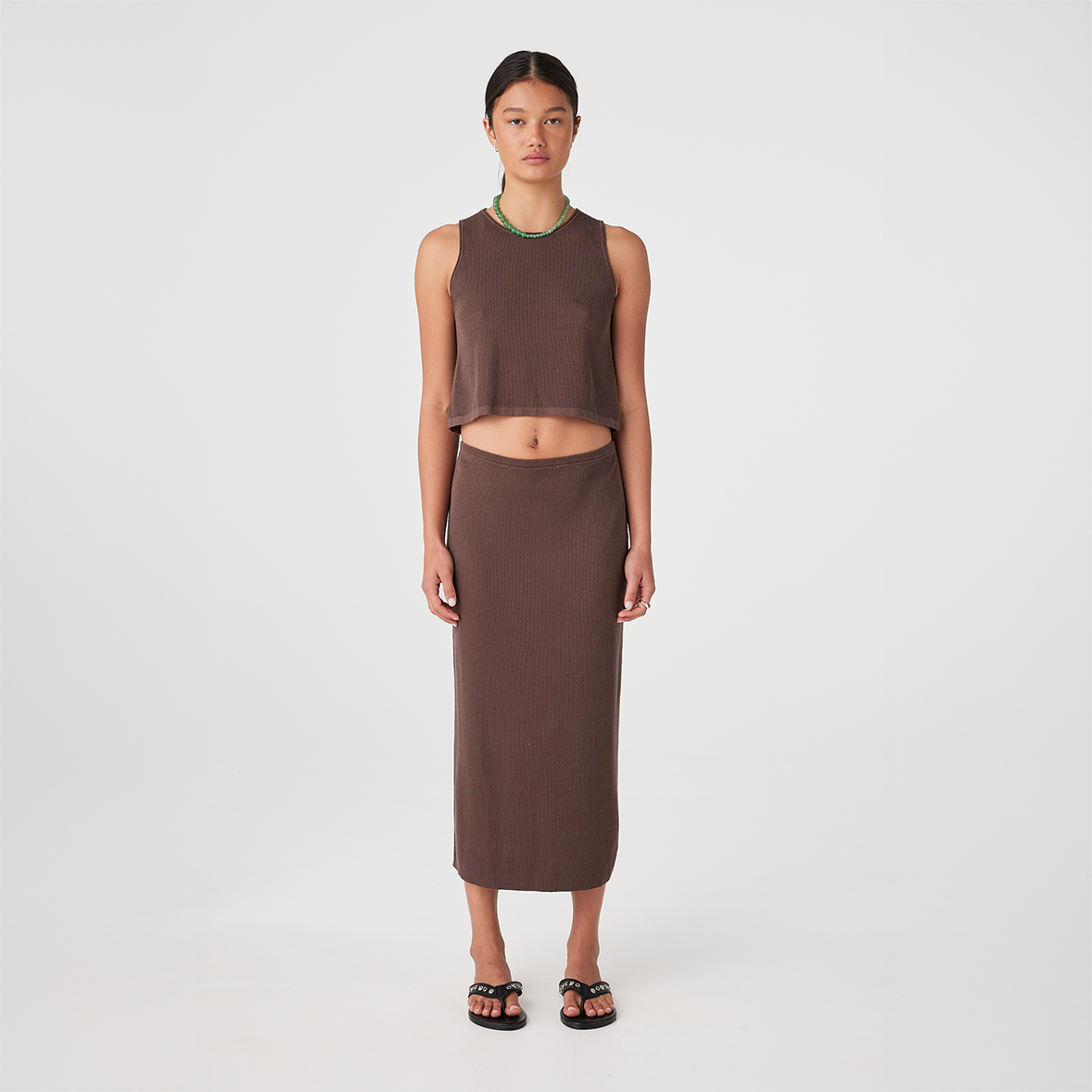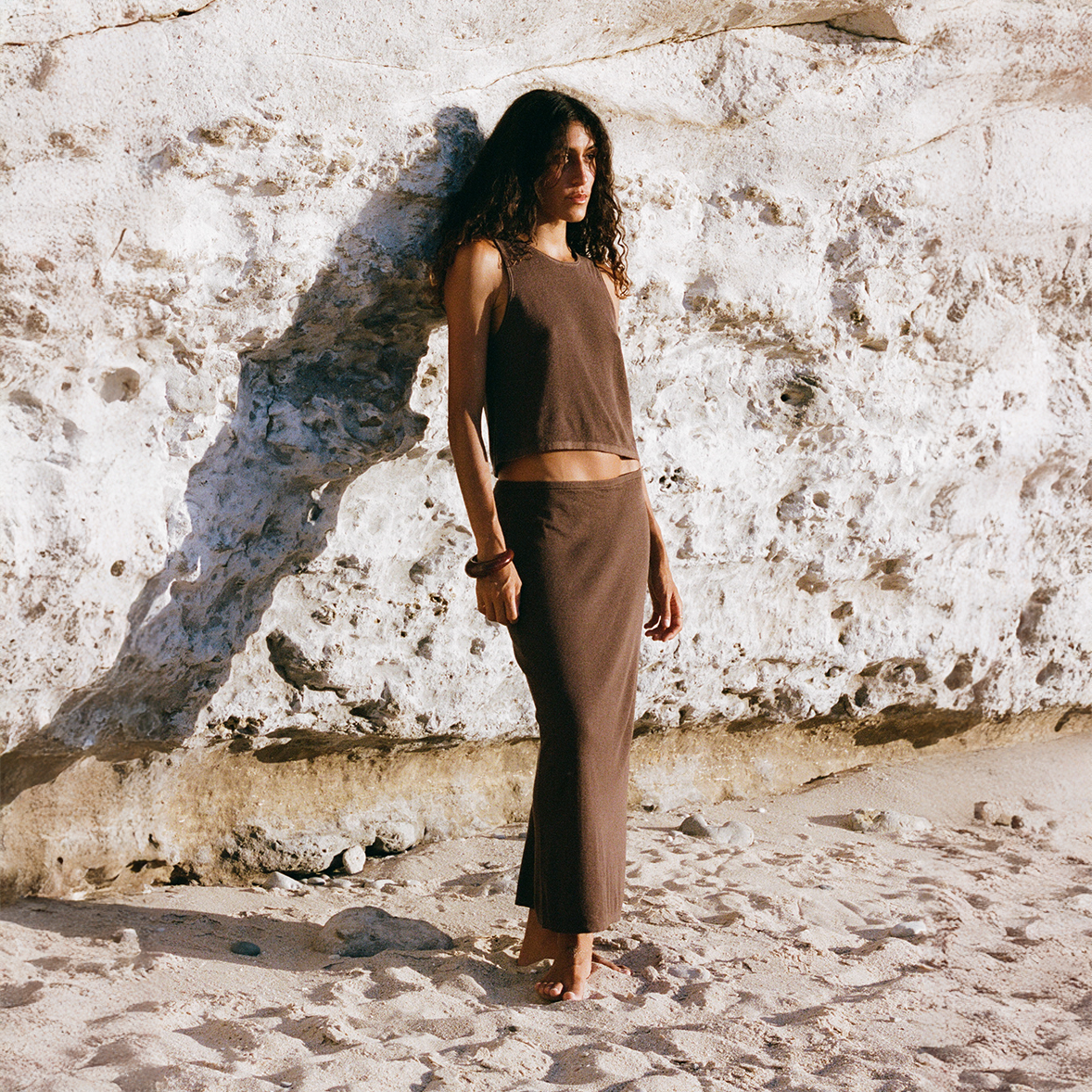 The Theo Tank in Espresso from Arcaa Movement is a soft rib knit tank crafted from a lightweight blend of 70% organic cotton and 30% hemp. Designed with a relaxed body and gentle flare at the hem, it offers breathable comfort with rolled edge detailing at the neckline and armholes.