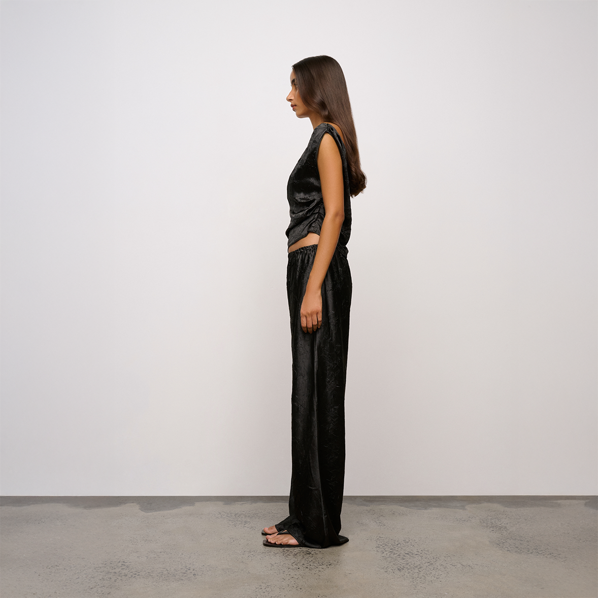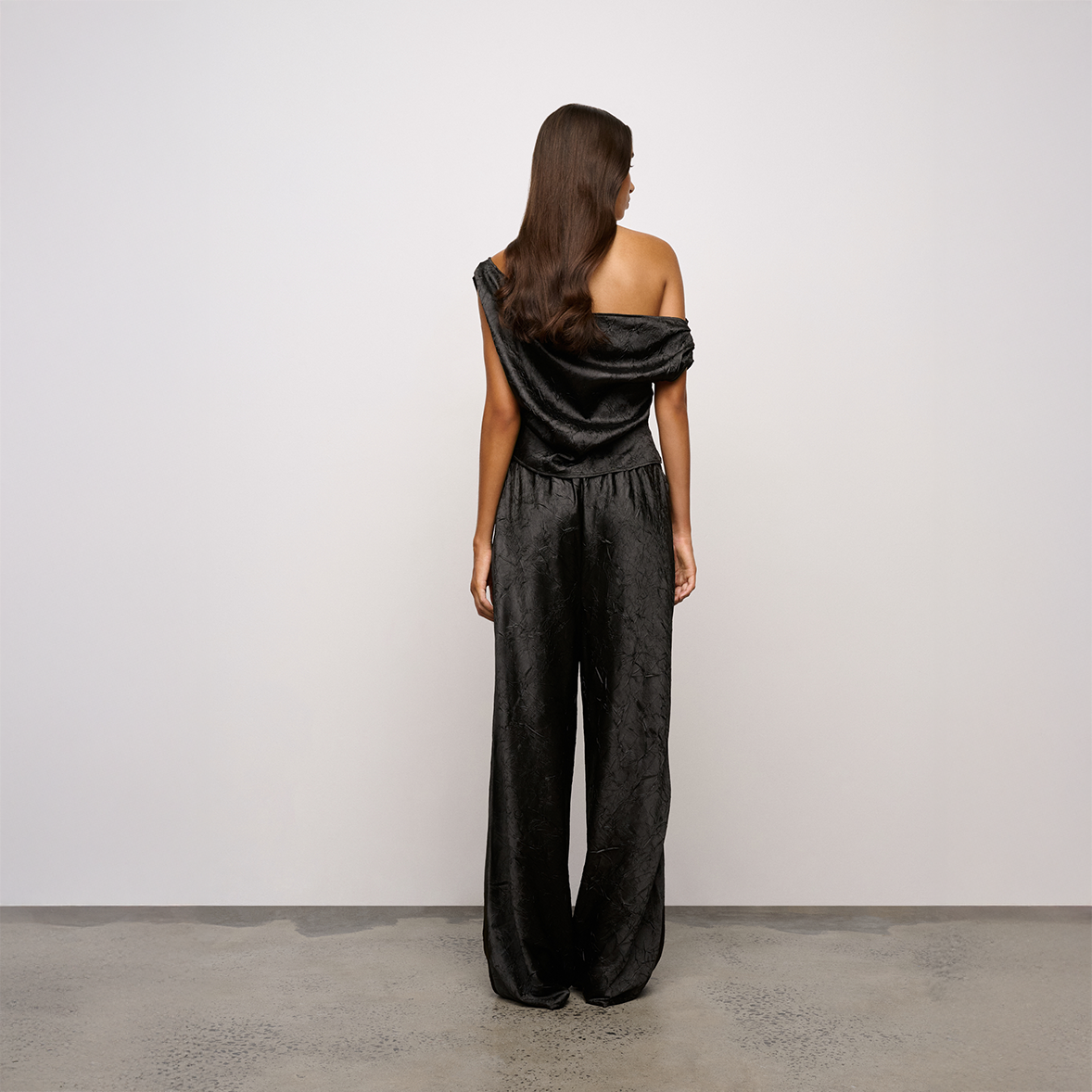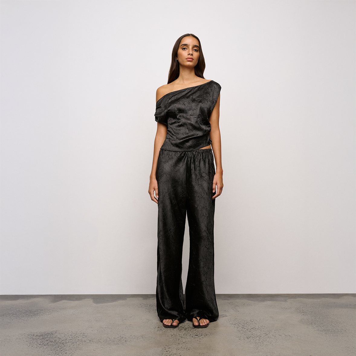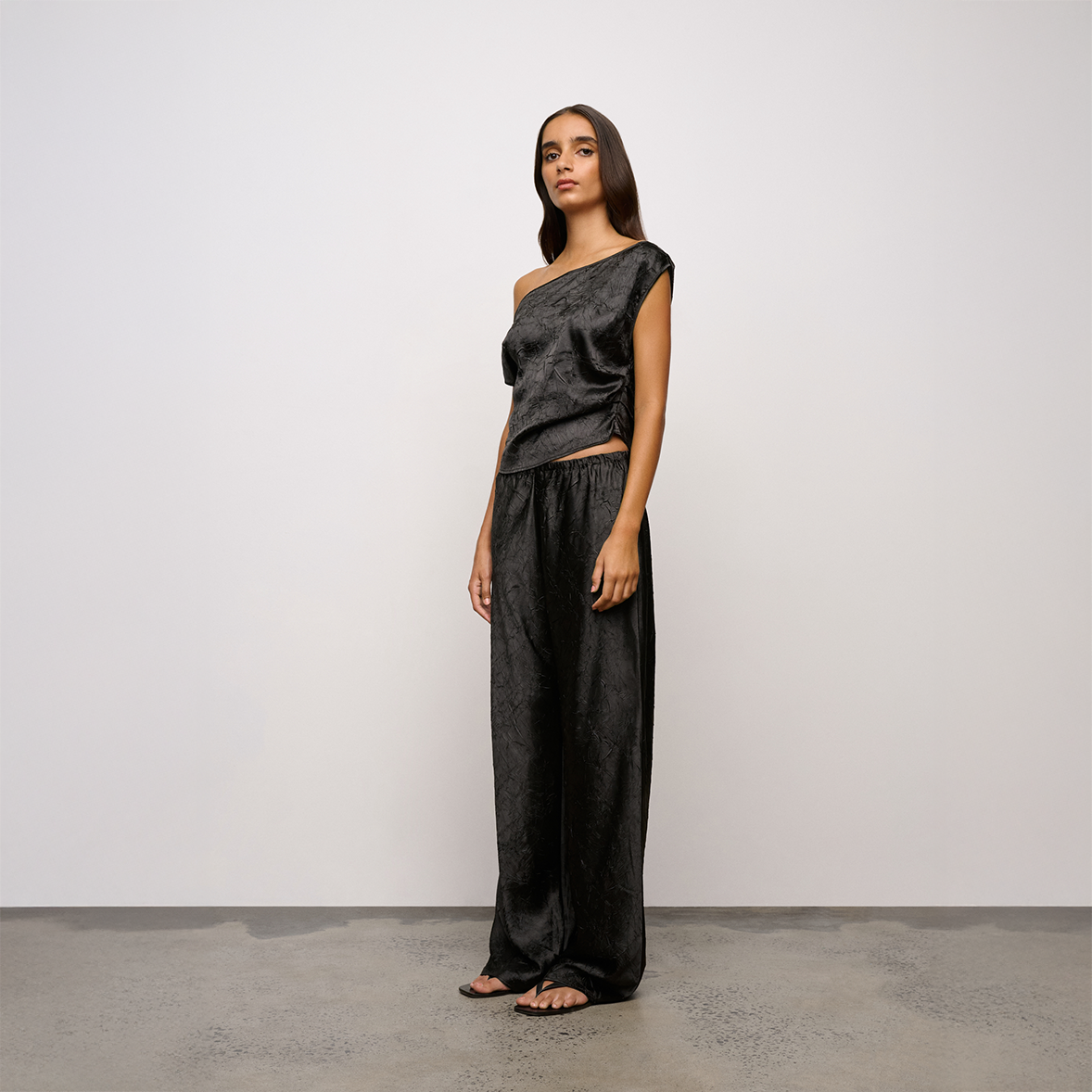 The Jacques Pant by One of Others is a relaxed silhouette, bias-cut for natural drape and ease. Crafted in a textured crushed satin fabrication, it falls fluidly through the leg with an elasticated waistband for comfort.