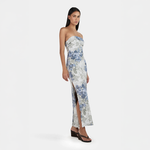 The Keke Midi Dress from Ownley is a strapless maxi silhouette with a fitted bodice and gathered detailing. Designed with a bust overlay, side seam gathers through the hip, and a sleek straight hemline, it balances structure with ease.