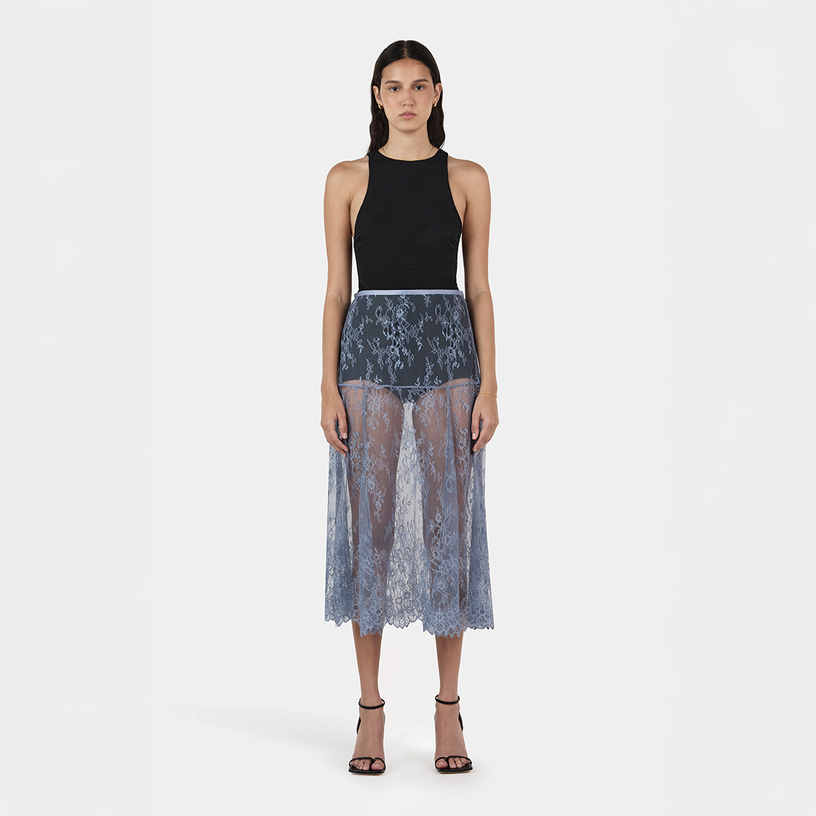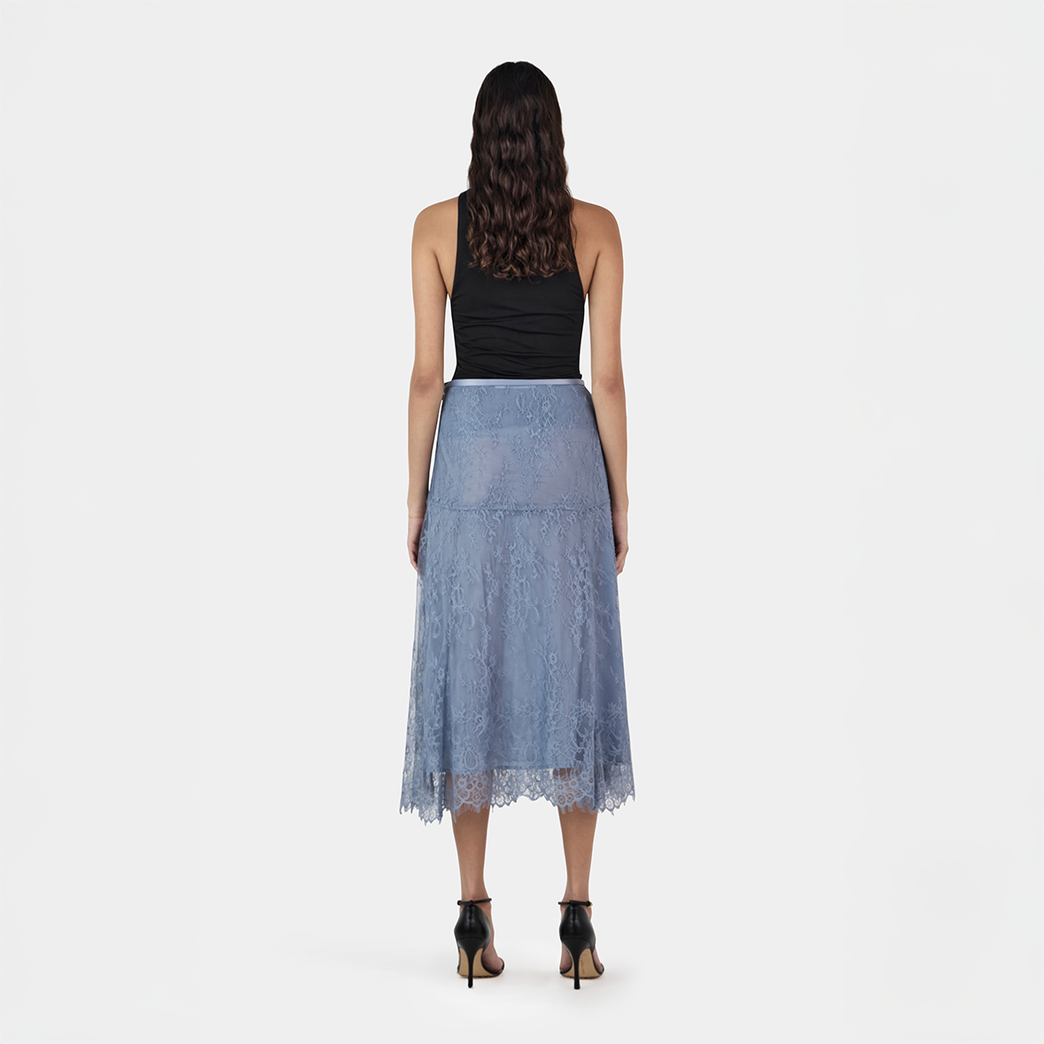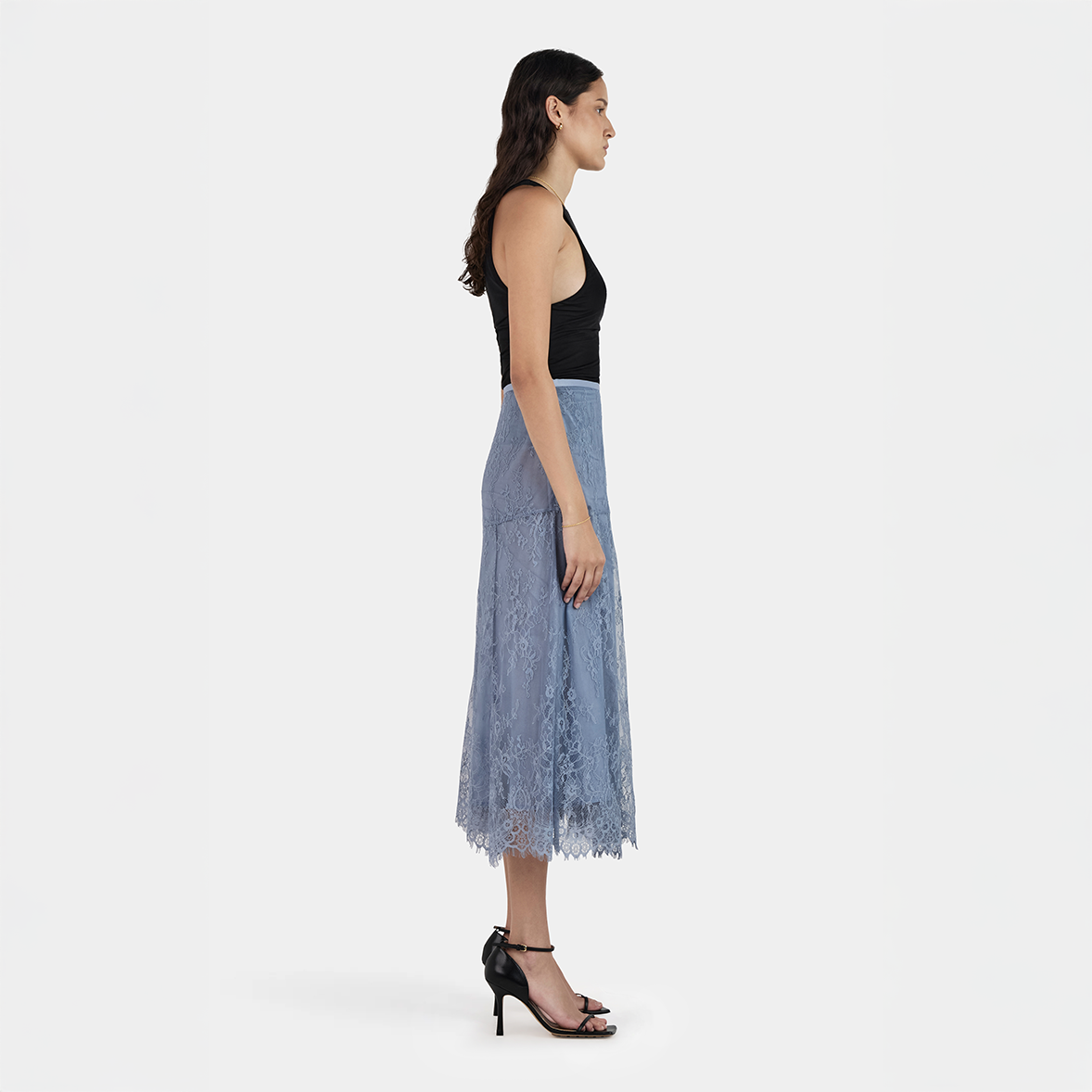 The Emanuel Lace Skirt in steel by Hansen & Gretel is a midi skirt rendered in sheer floral lace for a softly structured, romantic finish. Princess seams shape the silhouette, while the side invisible zip keeps things clean and minimal.