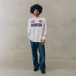The Moto Tee in white by Ssaint features the same oversized, race-inspired long sleeve shape, now in a clean white base that highlights the bold sponsor-style artwork. Cut from soft cotton with a relaxed drape, it’s designed to feel lived-in while delivering a visually strong, street-led look.