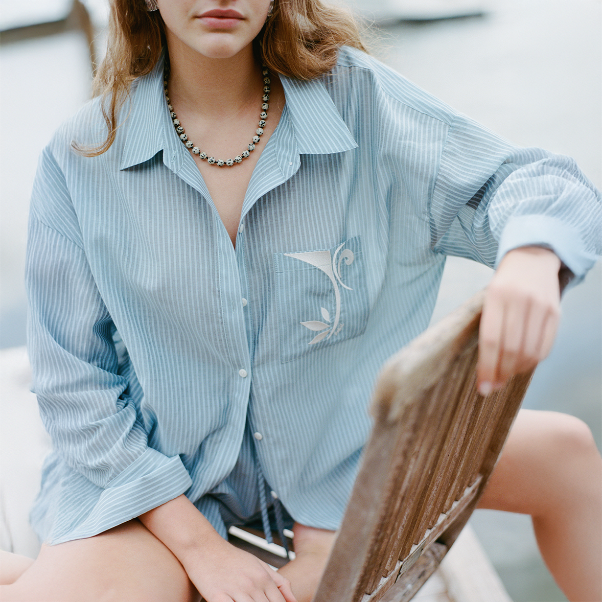 The Keaton Shirt in Ripple by Soleil Soleil is a classic long‑sleeve button‑up crafted from a silk‑cotton blend, designed with an oversized unisex fit and custom Soleil Soleil buttons. “Ripple” scales the Reed motif into organic parallel lines in an embroidered stripe design.