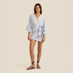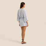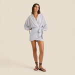 The Xanthe Mini Dress in Cirrus by Soleil Soleil is a robe‑style wrap mini with a plunging neckline and billowy sleeves finished with elegant cuff ties. A fully adjustable waist tie creates a cascading drape and a customised fit - cinch in at the side to preference and wear her from beach to bar, or anywhere in between.