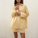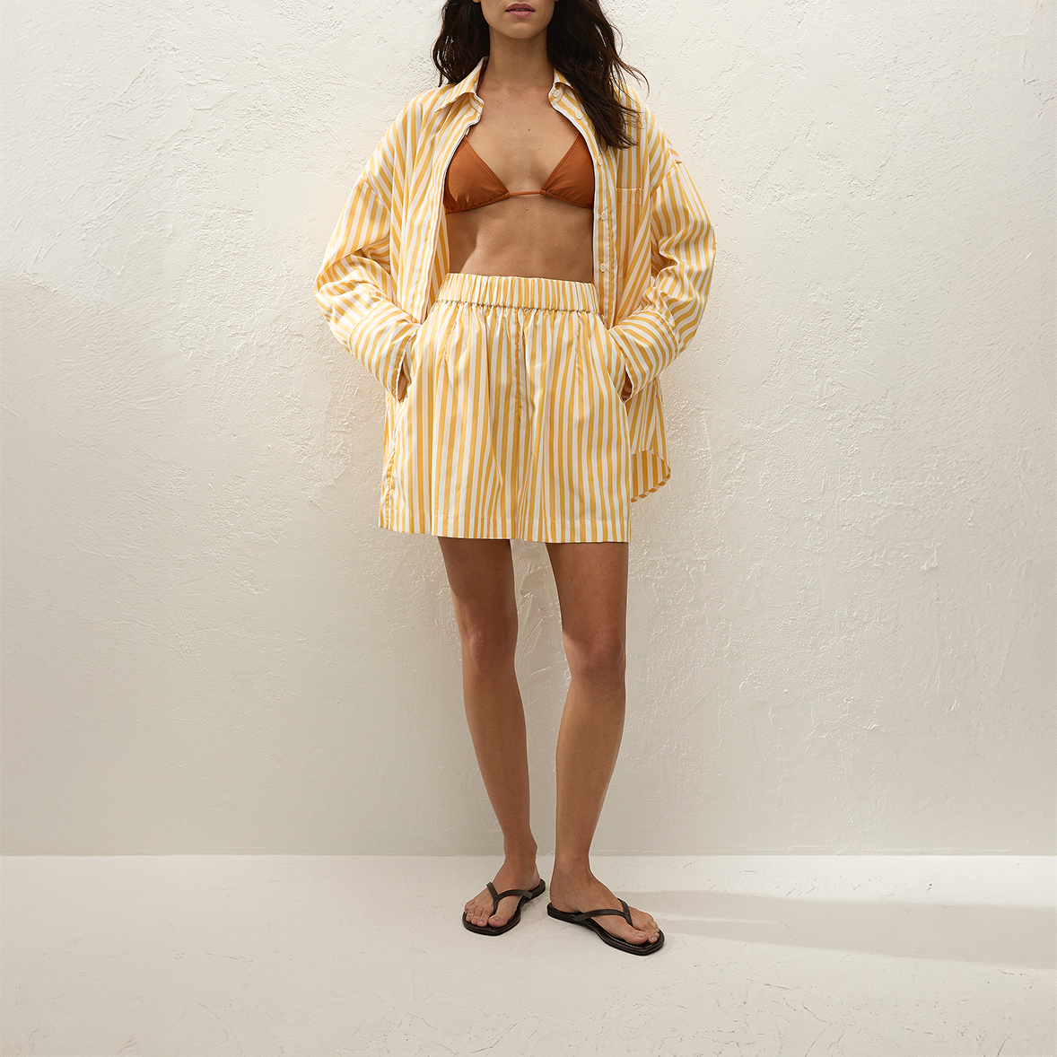 The Clemente Short in Mustard Stripe from Faithfull the Brand is an everyday, vacation-inspired short crafted from 100% BCI certified organic cotton, yarn-dyed in a faded yellow and white stripe. Designed with an elasticated waistband, a mock front fly opening and side seam pockets, it features a relaxed, boyfriend-style silhouette for easy warm-weather wear.
