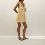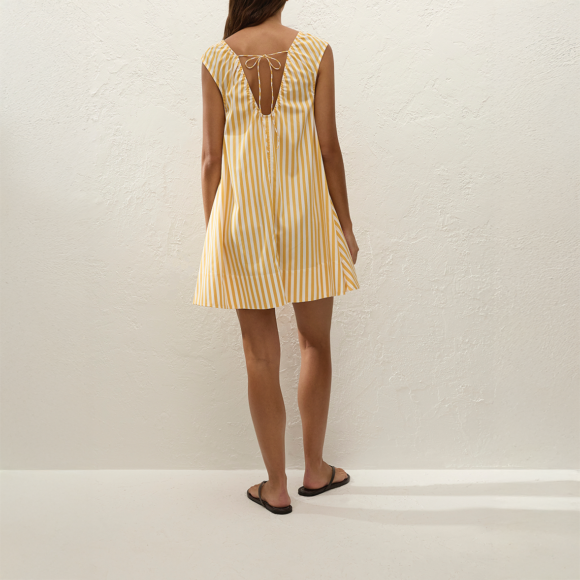 The Pedrera Mini Dress in Mustard Stripe from Faithfull the Brand is an everyday mini dress crafted from 100% BCI certified organic cotton, yarn-dyed in a faded yellow and white stripe. Designed with a scoop neckline, it features a relaxed silhouette that flares into an easy A-line shape, complete with side seam pockets. A scoop back with a simple tie detail and subtle gathering adds a considered finish.