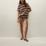The Playa Mini Short in Macro Carob Stripe from Faithfull the Brand is a mid-rise mini short crafted from a cotton and viscose blend in a chocolate brown stripe. Designed to sit comfortably on the hips, it features a fitted silhouette that crops short on the body, finished with a ribbed waistband and hemline.