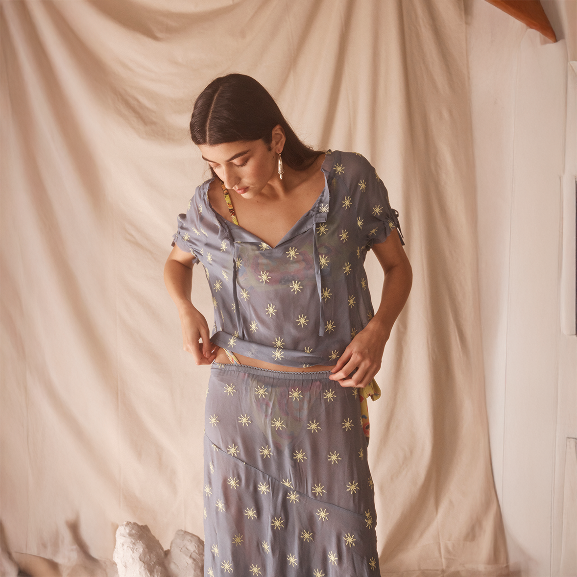 The Solstice Luce Skirt by Kinga Csilla is a fluid, feminine piece designed to capture light and movement. Cut from a sheer, airy fabric adorned with delicate sunburst embroidery, it brings an ethereal charm to summer dressing. The flowing silhouette and asymmetrical hemline flicker as you walk, made for warm nights and wanderings.