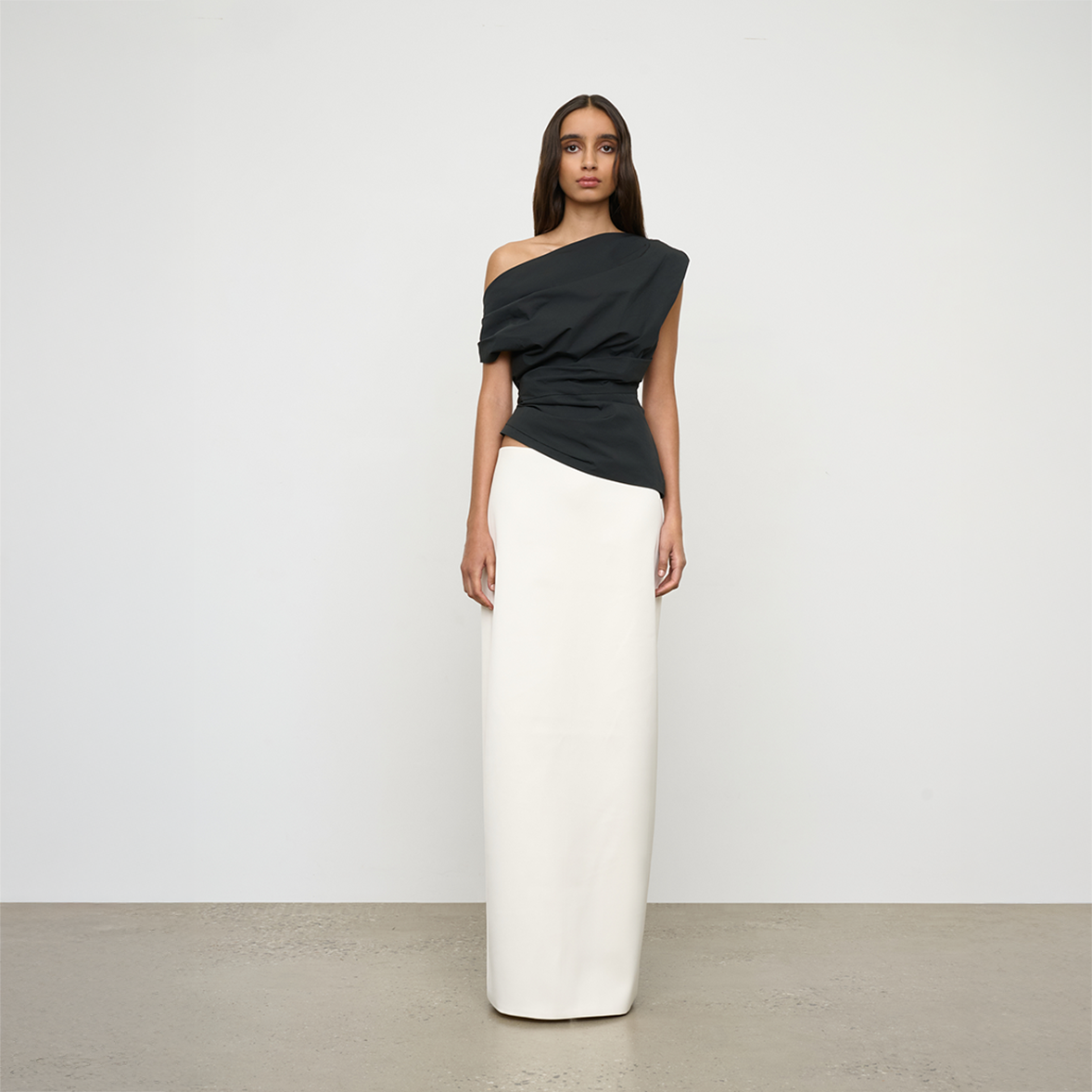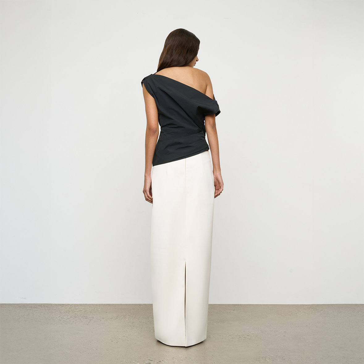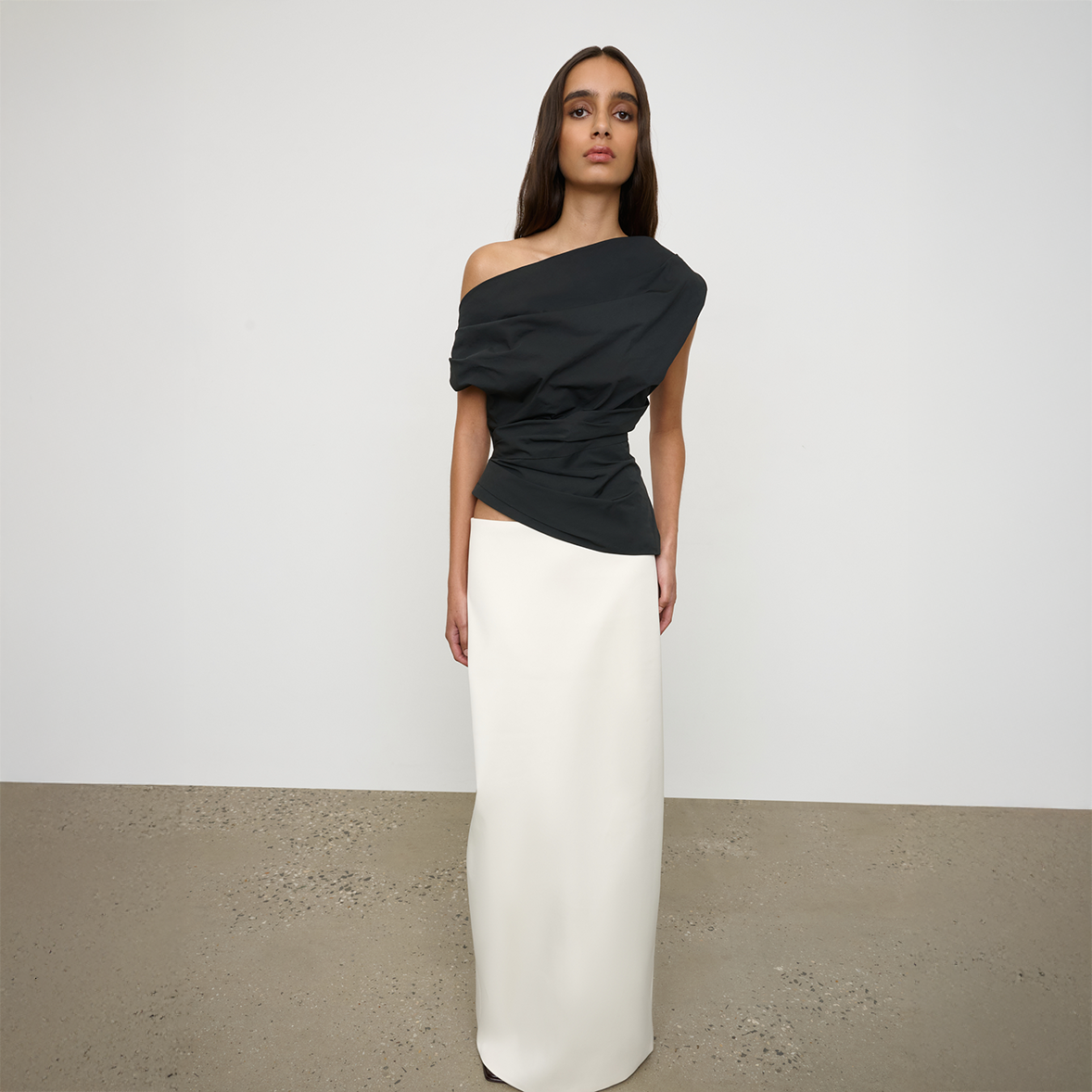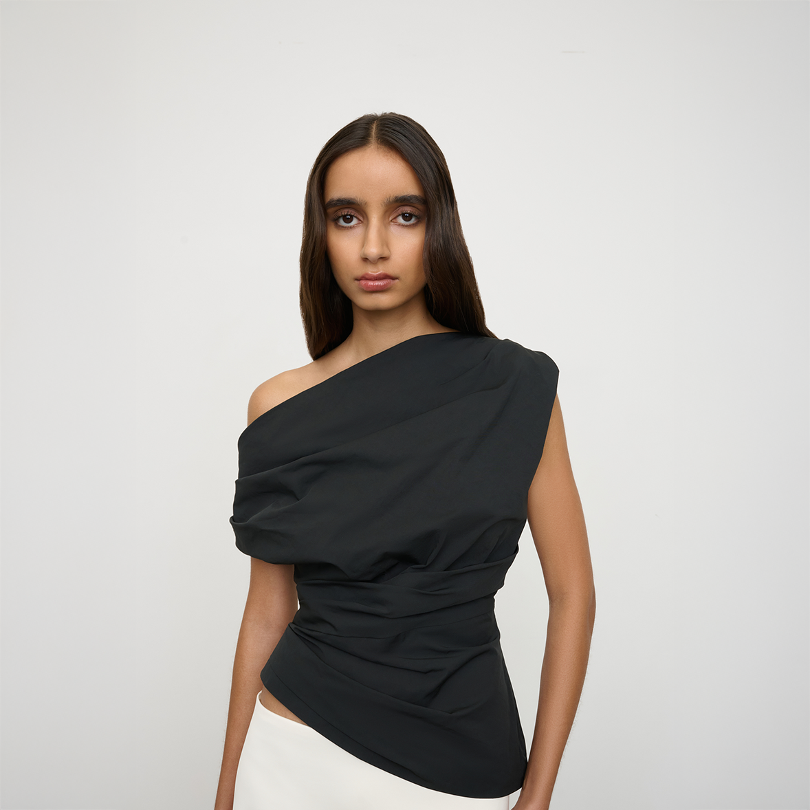 The Pallas Top in Black from One of Others is a minimal, refined top designed with clean lines and a considered silhouette. A draped, off shoulder top with tuck detail in a lightweight cotton blend with soft, crisp handle, it's understated shape makes it an easy foundational piece for layering or wearing on its own.