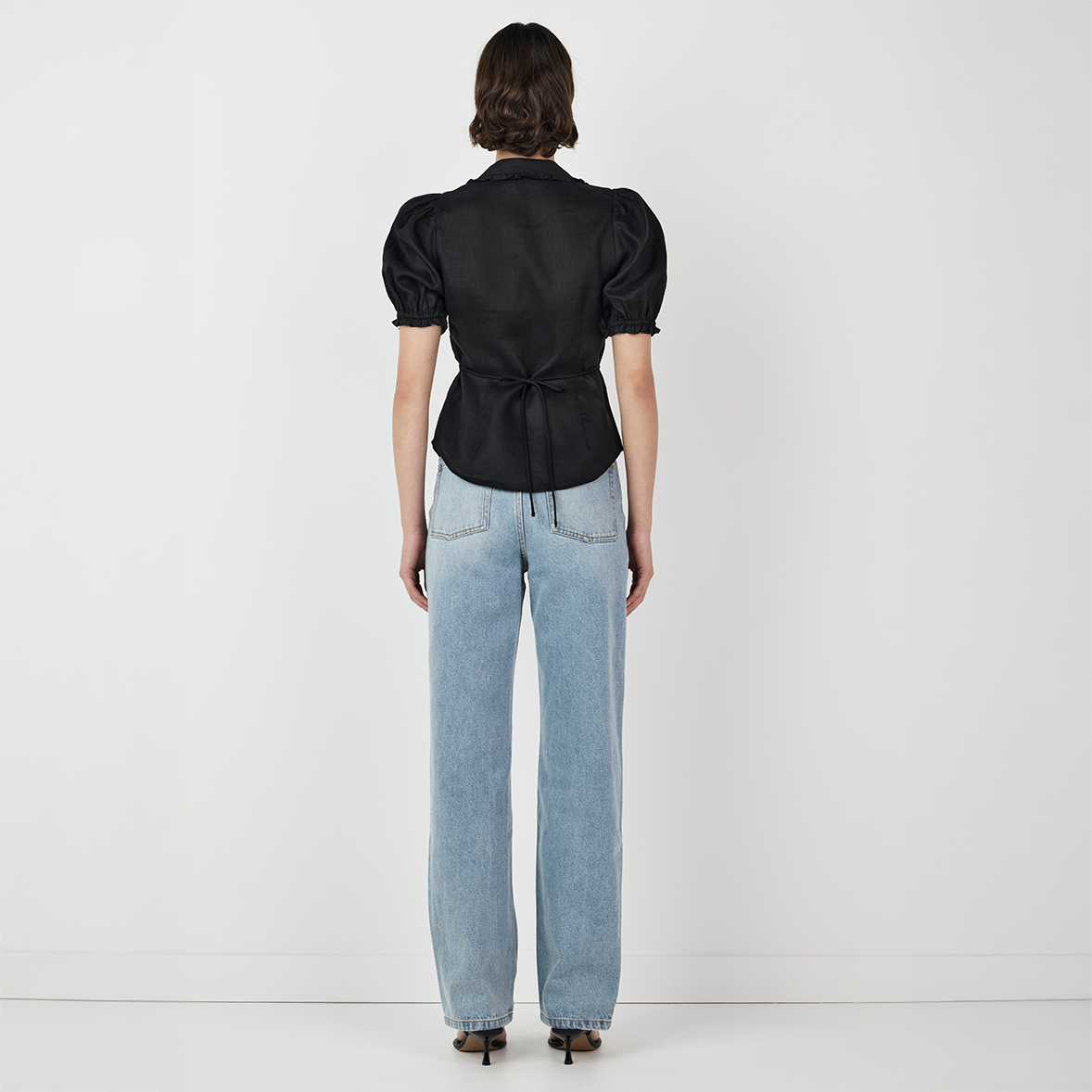 The Izzy Linen Shirt in black by Ownley is a puff sleeve shirt finished with a peter pan style collar and ruffle detailing. A self tie at the back allows you to cinch the waist for a defined silhouette.
