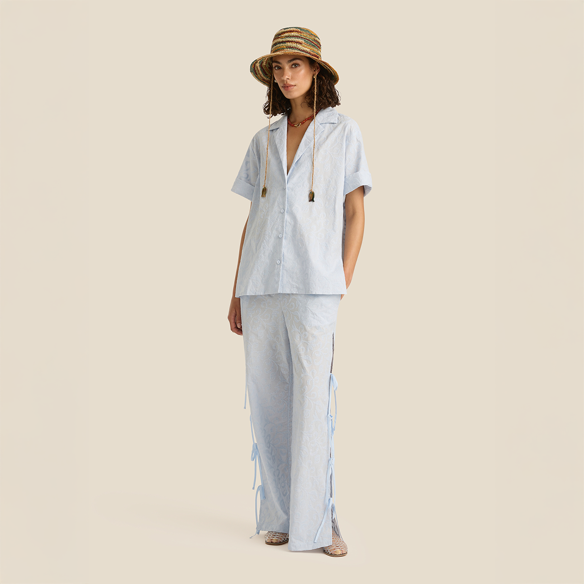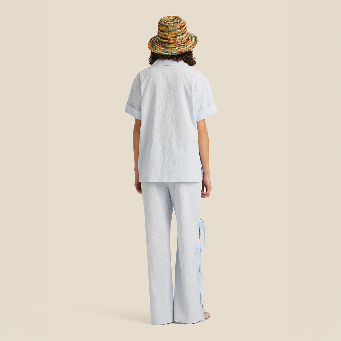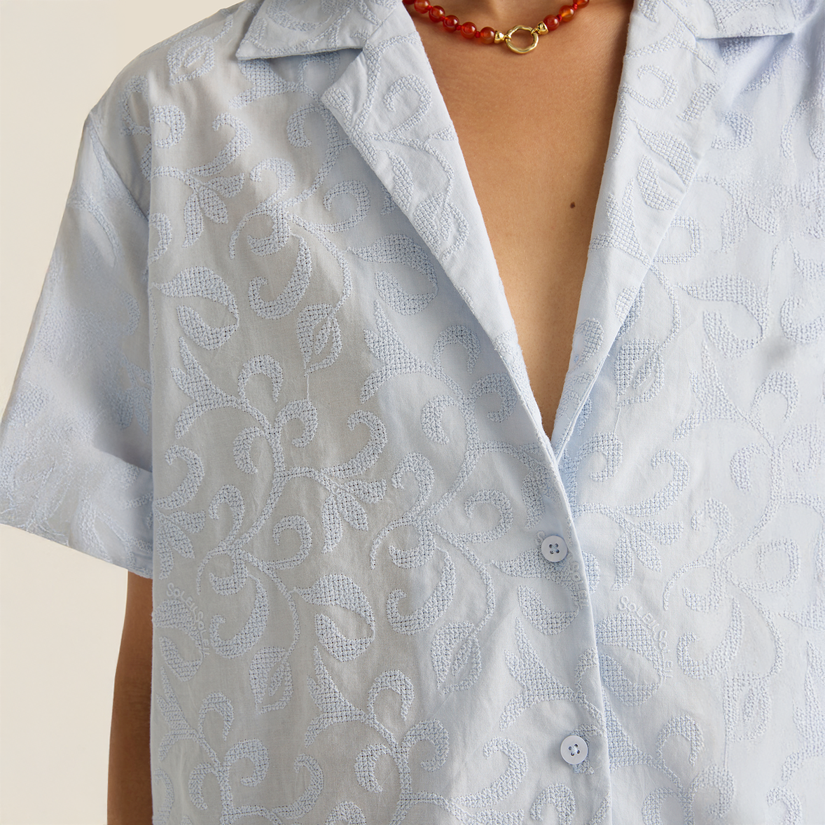 The Margot Shirt - Cirrus by Soleil Soleil reinterprets a classic short-sleeve button-up with an oversized, unisex fit and a relaxed camp collar. Cut to sit open and flat across the chest, it’s designed to pair with the matching Sadie Pants.