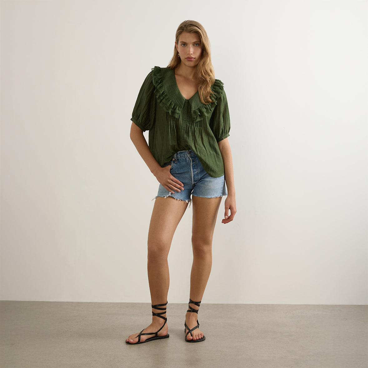 • Lace‑trimmed ruffle collar