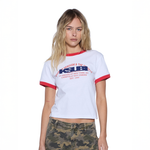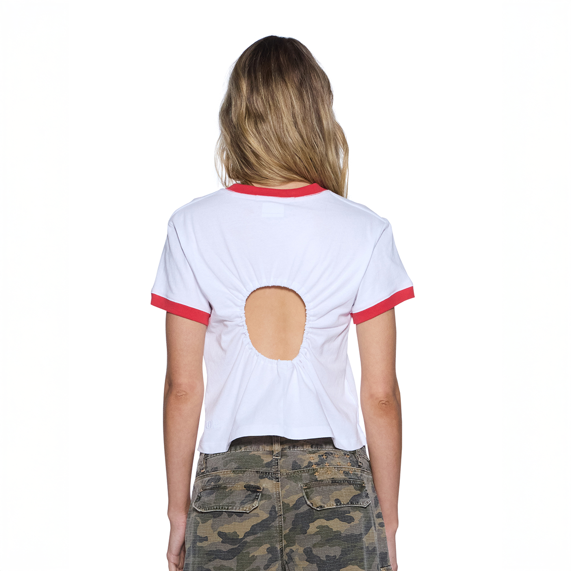 The Shruken Varsity Tee by Ksubi re-works heritage athletic aesthetics with a modern twist. Crafted from premium white cotton jersey, it features a varsity-inspired graphic across the chest, short sleeves, a crew neckline and a ruched circular back detail with an adjustable bungee cord for personalised fit and styling