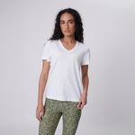The Halftime V Neck Tee in Ivory by Marlow is an active essential that blends sporty style with comfort, crafted from a soft, stretchy peached jersey fabric that moves with you. Designed with a standard t-shirt fit with a flattering v-neck and curved back seam for a sporty edge. Pair with your favourite Marlow activewear or everyday outfits for a polished yet practical look.
