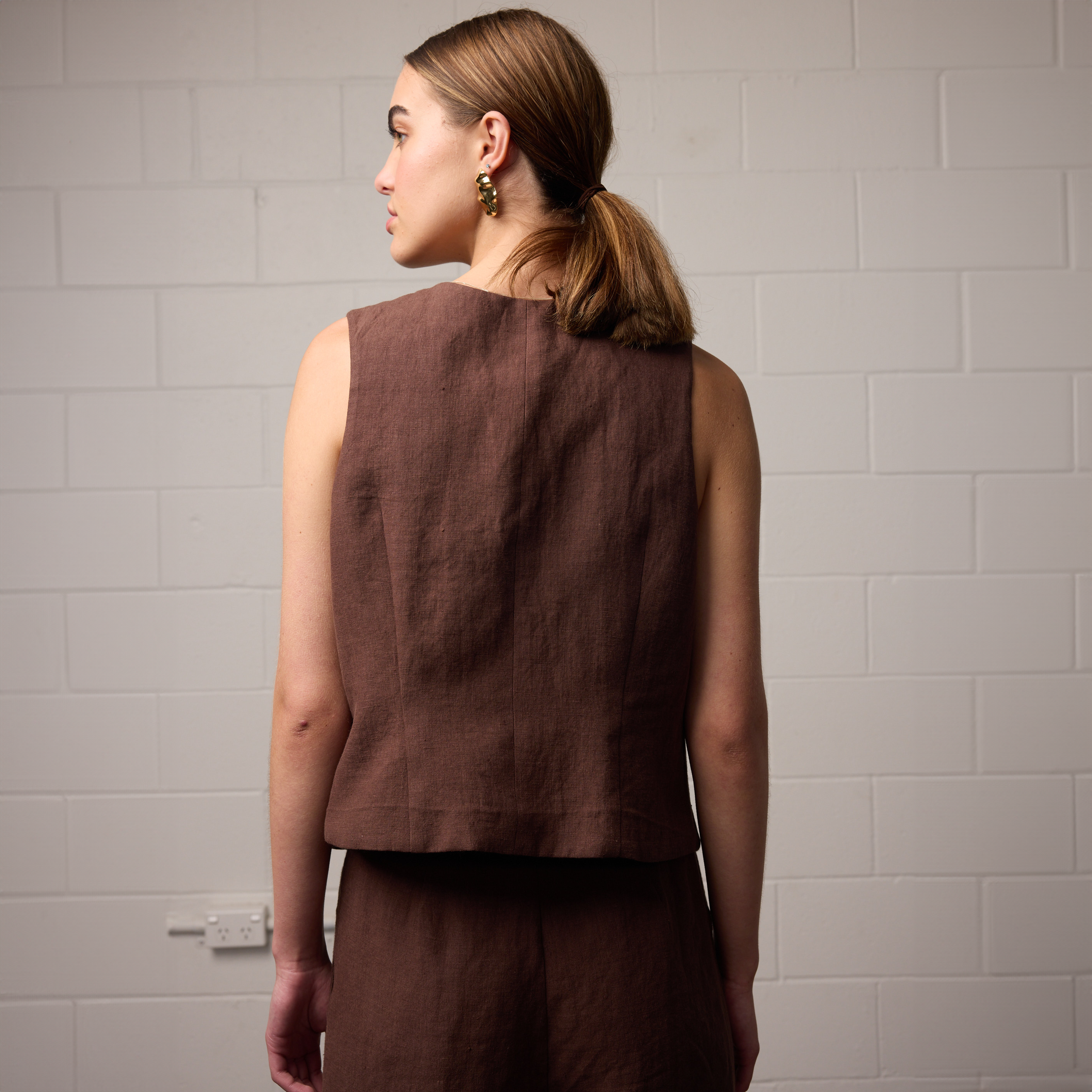 The Sylvia Vest by Towa is the layering piece of the season. This tailored vest blends feminine ease with a borrowed-from-the-boys attitude, designed to pair perfectly with the matching Theo Pant.
