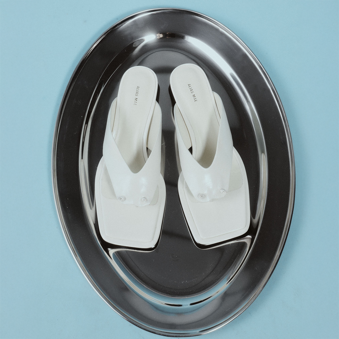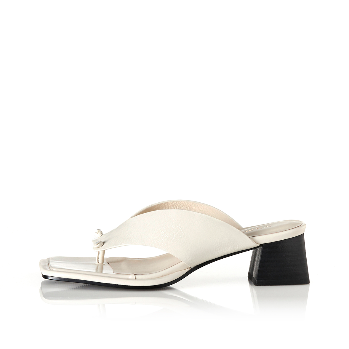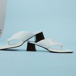 The Alina Sandal in Bone by Alias Mae is a sleek mid-heel sandal with a knotted thong upper and squared toe, finished with a block heel for comfortable lift.