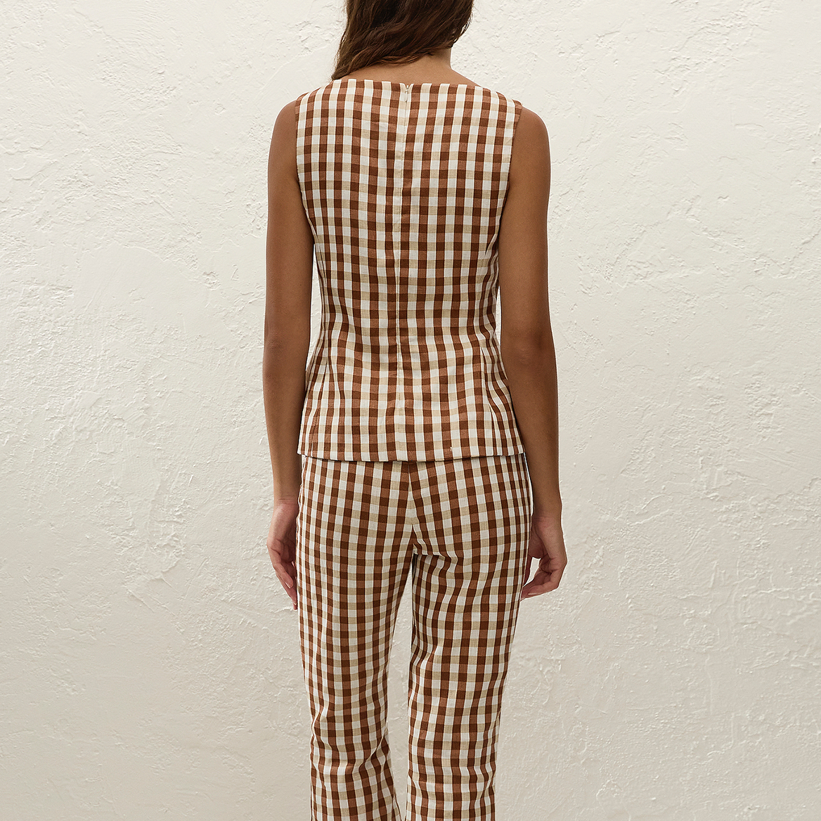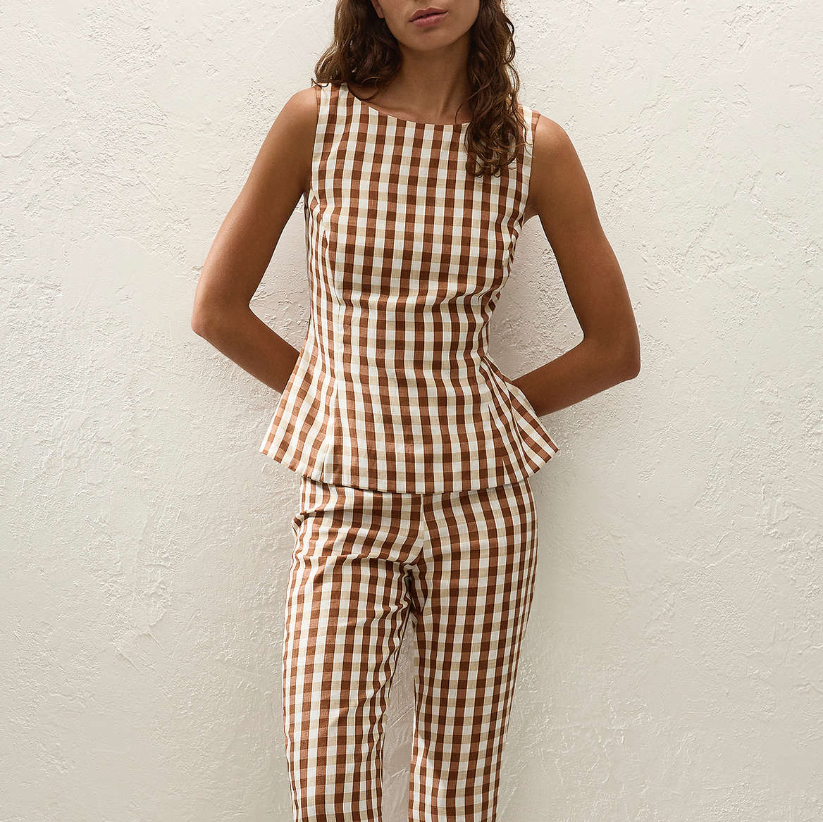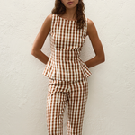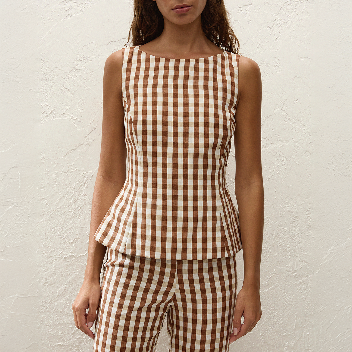 The Ana Top Gingham Cedar by Faithfull The Brand brings a soft 1960s to everyday dressing. Crafted from signature European Flax® linen in a gingham print, it’s designed with a sleeveless, boat-style neckline and a fitted bodice that gently cinches at the waist. The shape flares into a relaxed peplum hem that sits cropped at the hips, offering an easy, vintage-feeling silhouette.