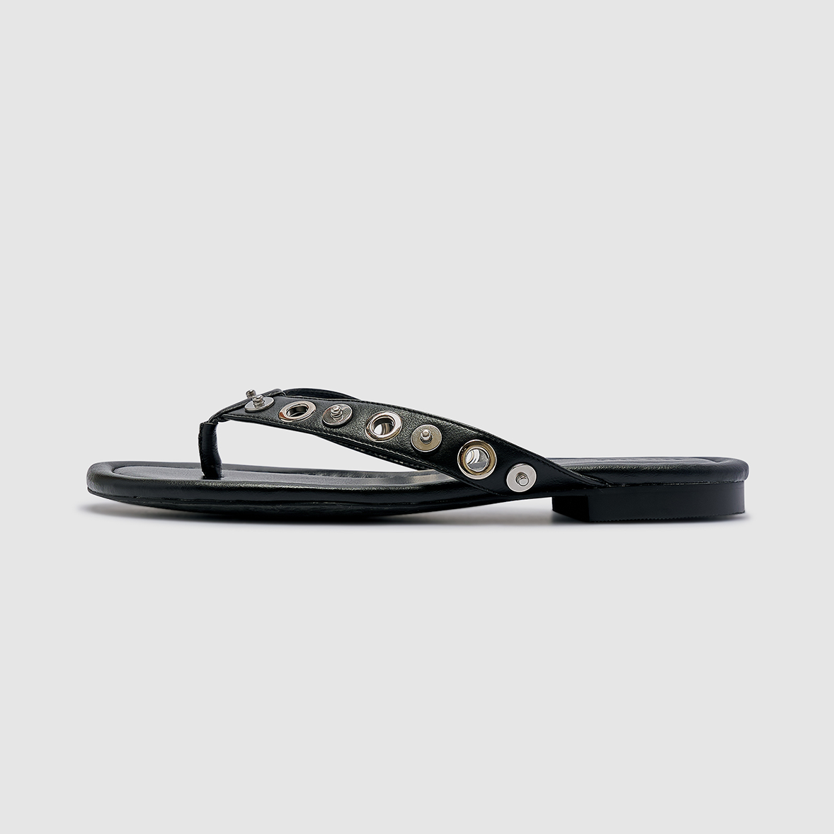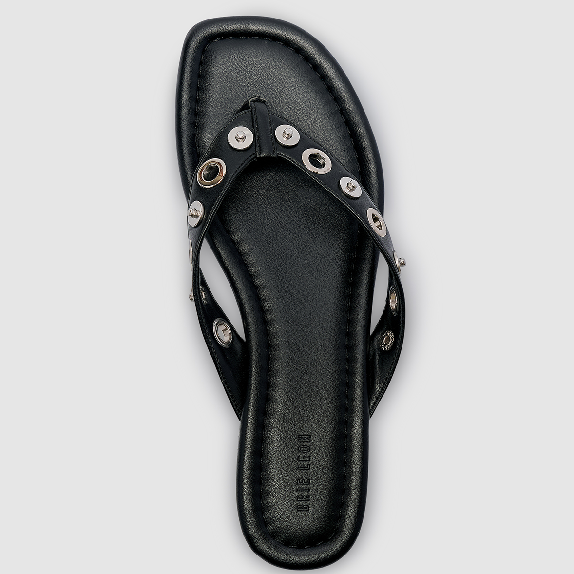 The Eyelet Sandal in black by Brie Leon is a sleek thong silhouette accented with metal eyelets - a modern twist on an everyday essential. Crafted with a recycled smooth PU upper and lining, it’s finished with a square toe and cushioned footbed for everyday ease.