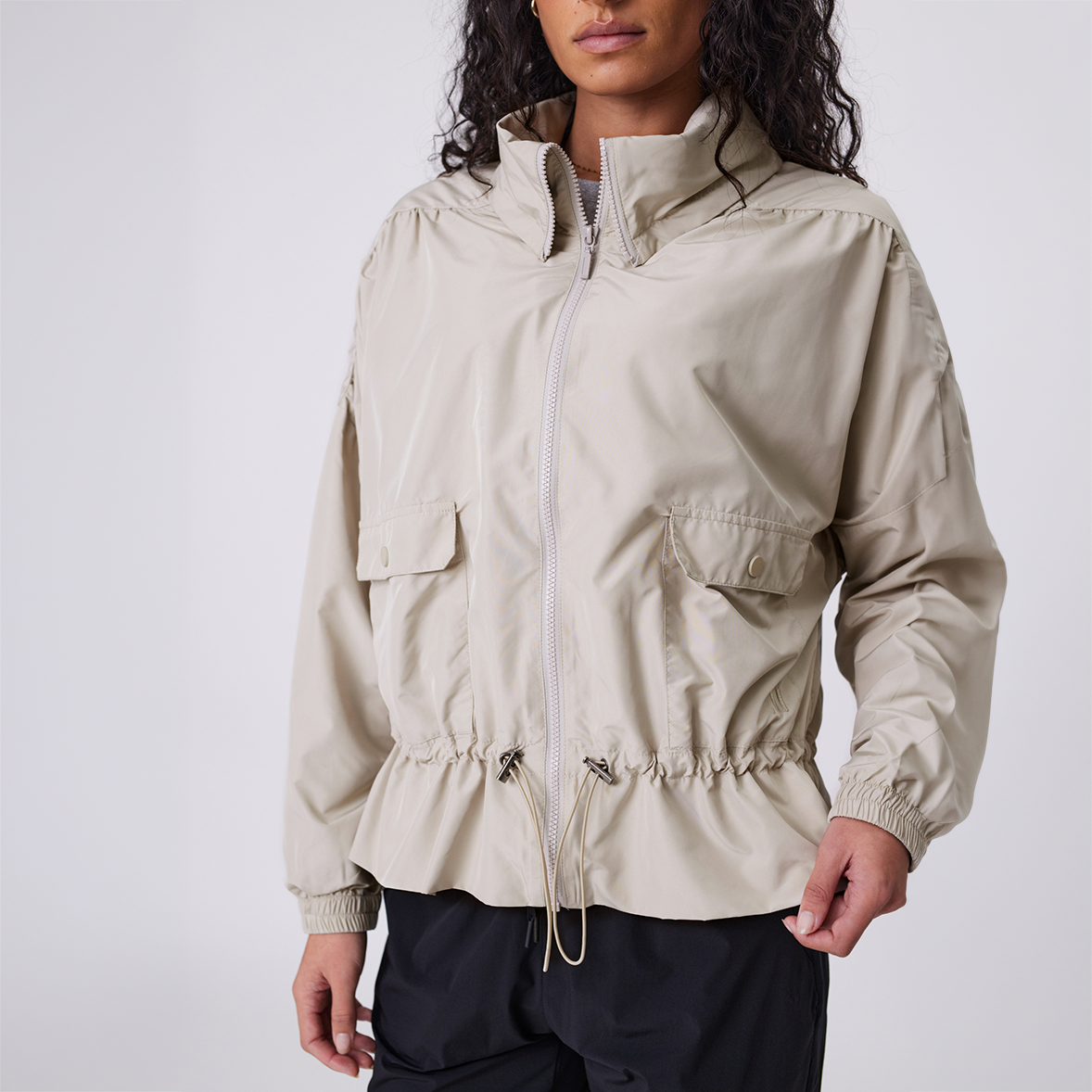Cut to a cropped hip length, it features an adjustable cinched waist with a bungee drawcord, a zip-through front and a concealed hood tucked neatly into the collar. Practical without feeling utilitarian, it layers effortlessly over dresses or pairs back with Marlow activewear for a sports-luxe finish.