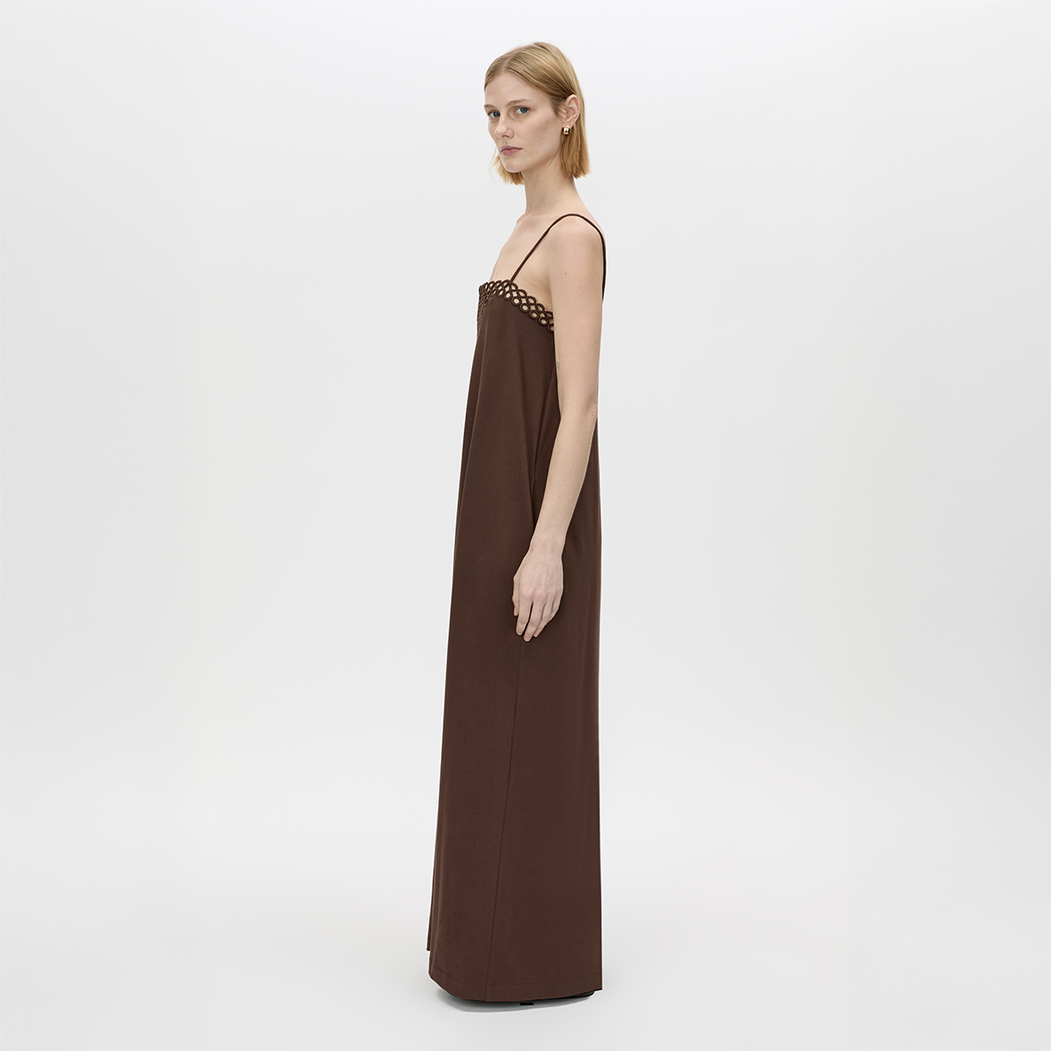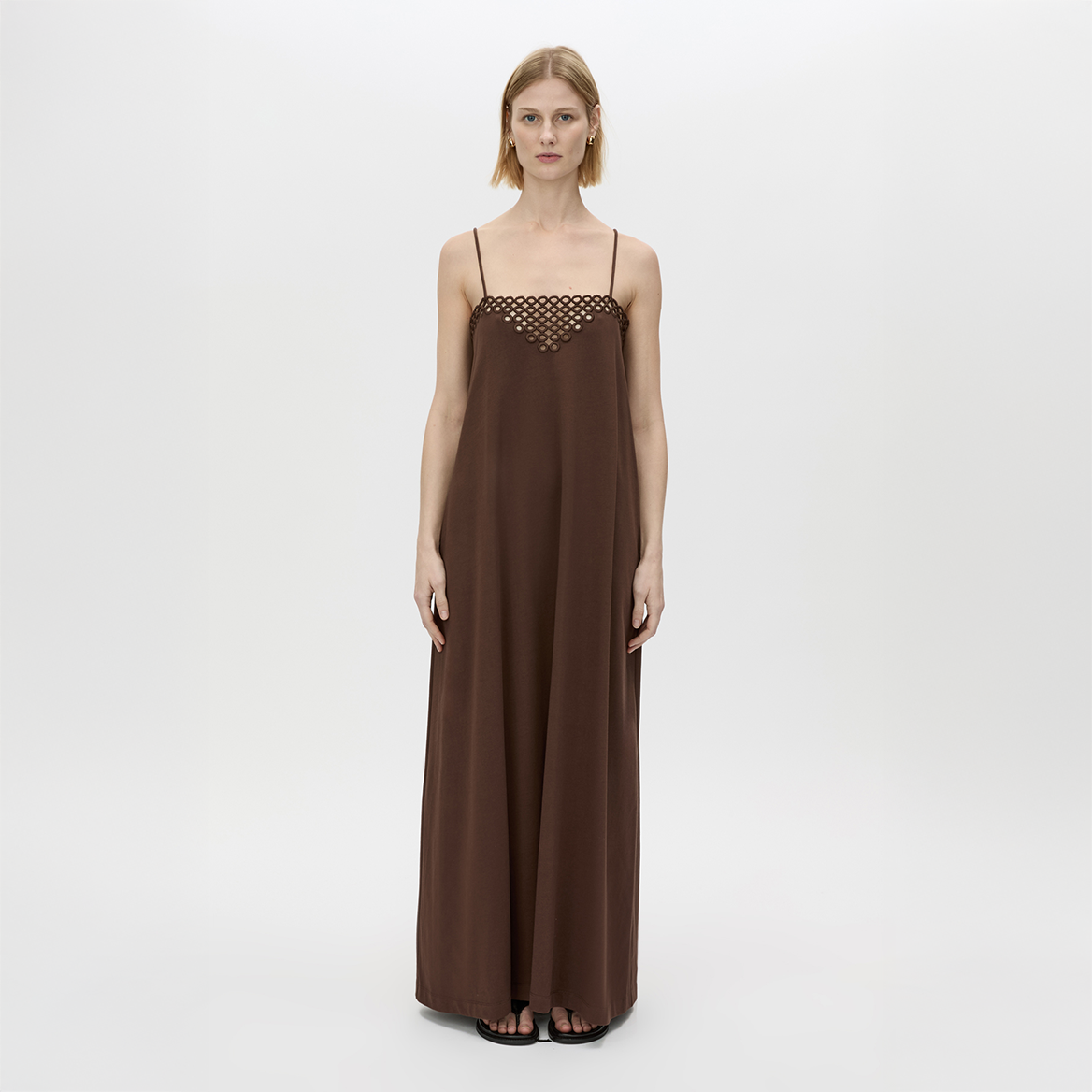 The Lolani Maxi Dress – Chocolate by Camilla & Marc is an effortless, full-length cotton silhouette that captures both relaxed ease and elevated style. Tailored in a flowing A-line shape, the dress showcases the label’s signature circular embroidery - a nod to movement, lightness and timeless sophistication. Thin adjustable straps and a subtle twin-needle hem add refined detail, making this piece perfect for warm-weather dressing or travel.