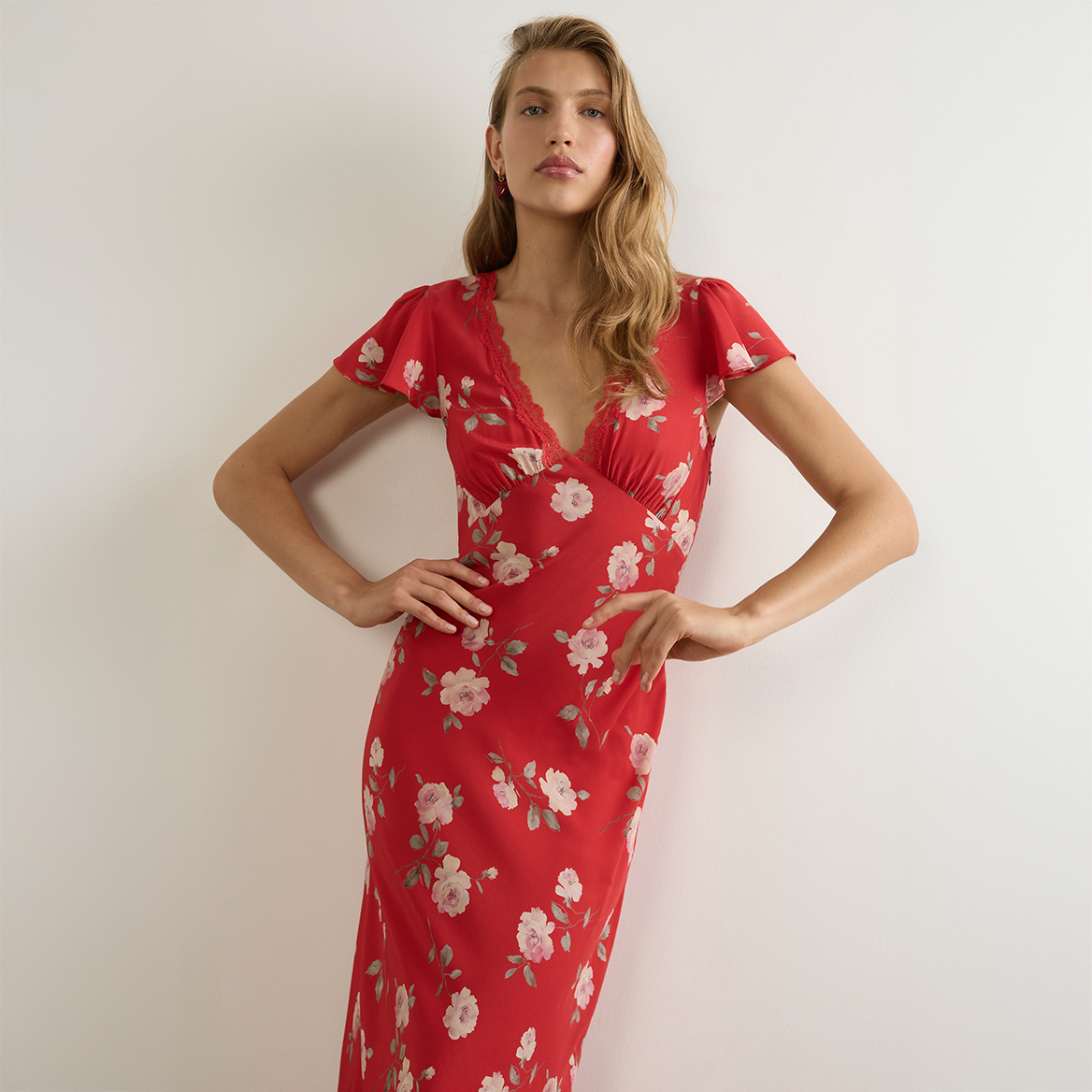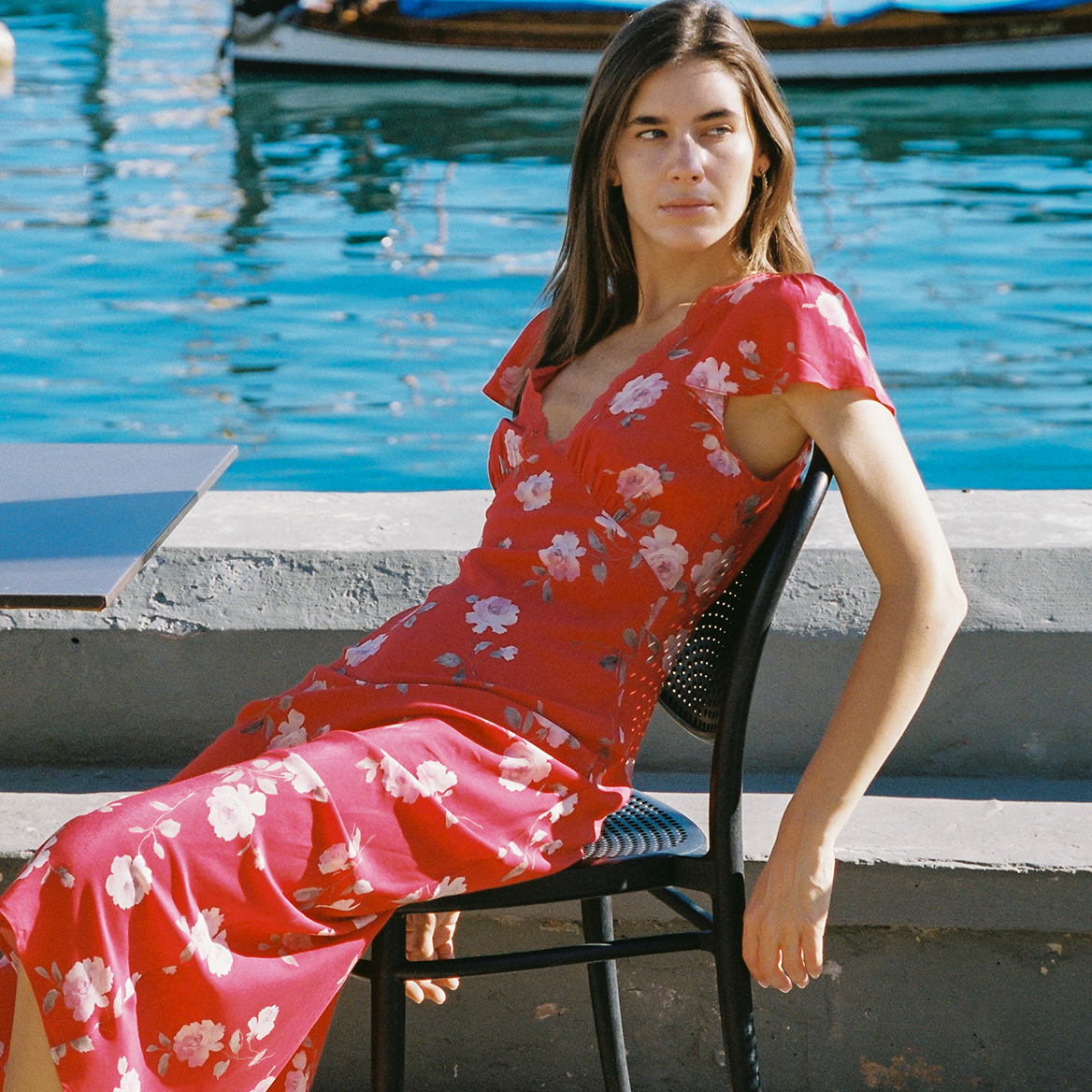 The Marena Midi Dress is an easy, feminine shape in the bold red Nova Floral. A soft V neckline trimmed in lace, gentle gathers through the bust, and airy flutter sleeves give it that relaxed, romantic feel. The bias-cut silhouette falls cleanly against the body, offering a smooth, effortless line you can slip into for day or evening.