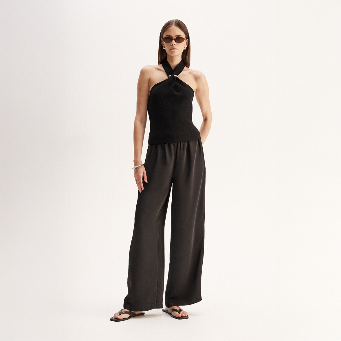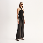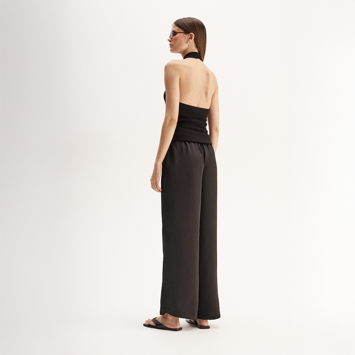 The Mina Pant in black by Elka Collective is made from recycled Japanese satin with a relaxed wide leg. The mid rise and elastic drawcord waist keep the fit easy for everyday wear.