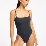 The Jetset Minimal Tank One Piece in charcoal by JETS is a square‑neck classic with a supportive internal shelf and removable cups. Designed for ease and clean coverage, it’s a go‑to silhouette for pool or beach.