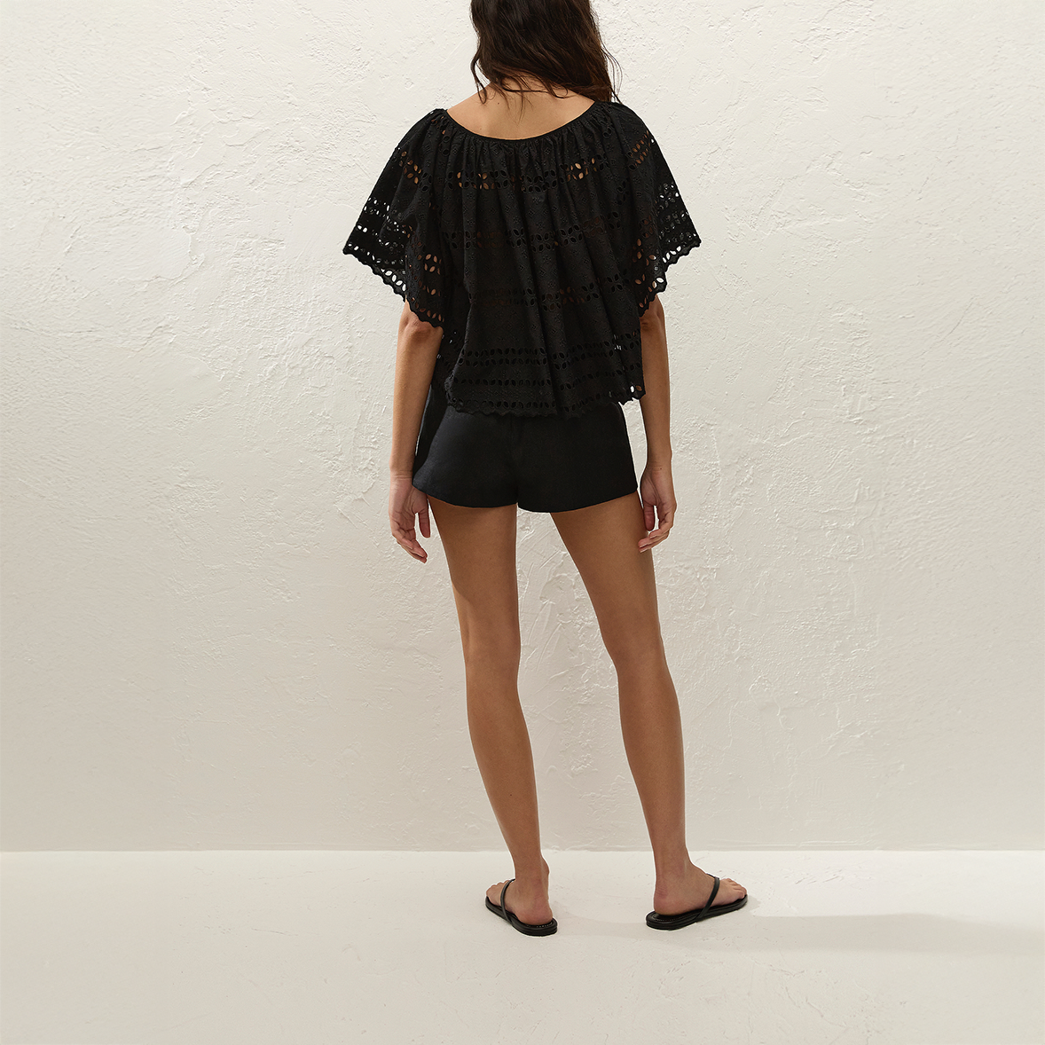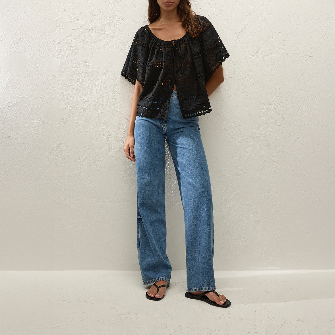 The Mitla Top in Broderie Black from Faithfull the Brand is a blouse-style top crafted from a delicate anglaise broderie fabrication. Designed with a relaxed, loose-fitting silhouette, it is intended to hang effortlessly off the body, featuring wide short sleeves and a delicate front tie detail. A raw-like hem finish completes the look with subtle texture.