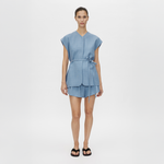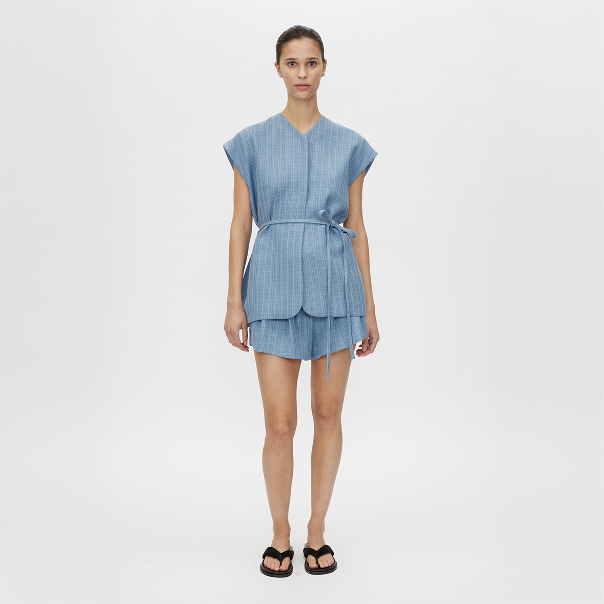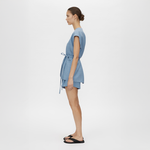 The Noguchi Sleeveless Vest by Camilla & Marc is a belted oversized vest in blue soft suiting. Designed with concealed internal recycled buttons, inseam pockets, belt loops with a matching belt, and a vent at the centre back, it offers a structured yet relaxed take on tailoring.