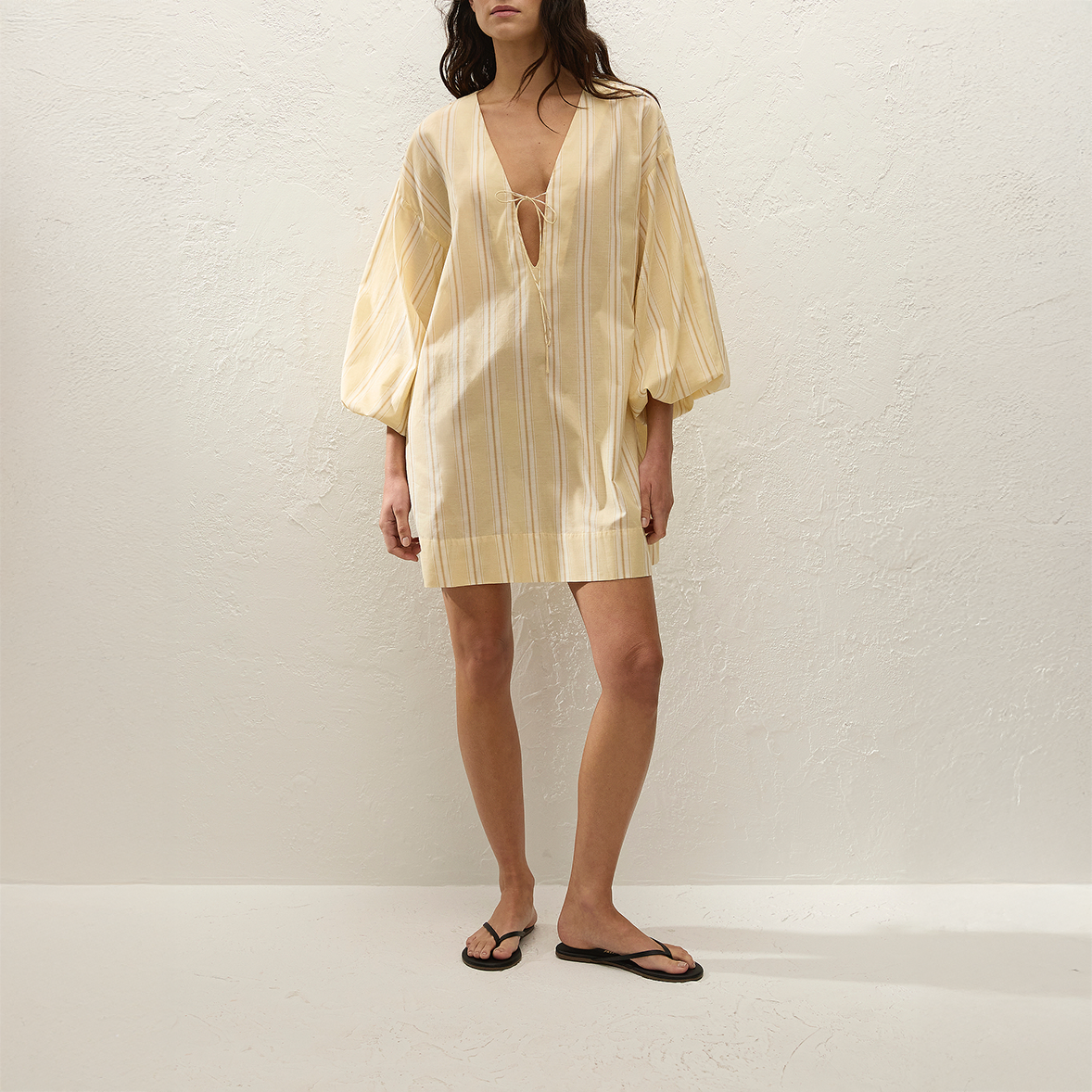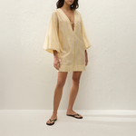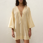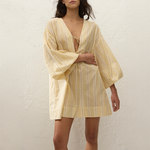 The Pia Mini Dress in Faded Mustard from Faithfull the Brand is a smock-style mini dress crafted from 100% BCI certified organic cotton, yarn-dyed in a faded yellow and white stripe. Designed with a deep V-neckline and tie detail, it features oversized balloon sleeves elasticated at the cuff and a relaxed silhouette intended to hang effortlessly off the body.