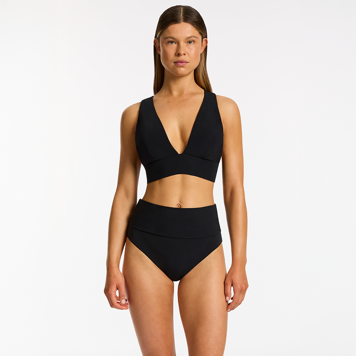 The Jetset Soft Triangle Bikini Top in black by JETS is a classic triangle reimagined for comfort, featuring removable cups and a supportive underbust band. Smooth, contouring fabric offers a sleek finish under layers.